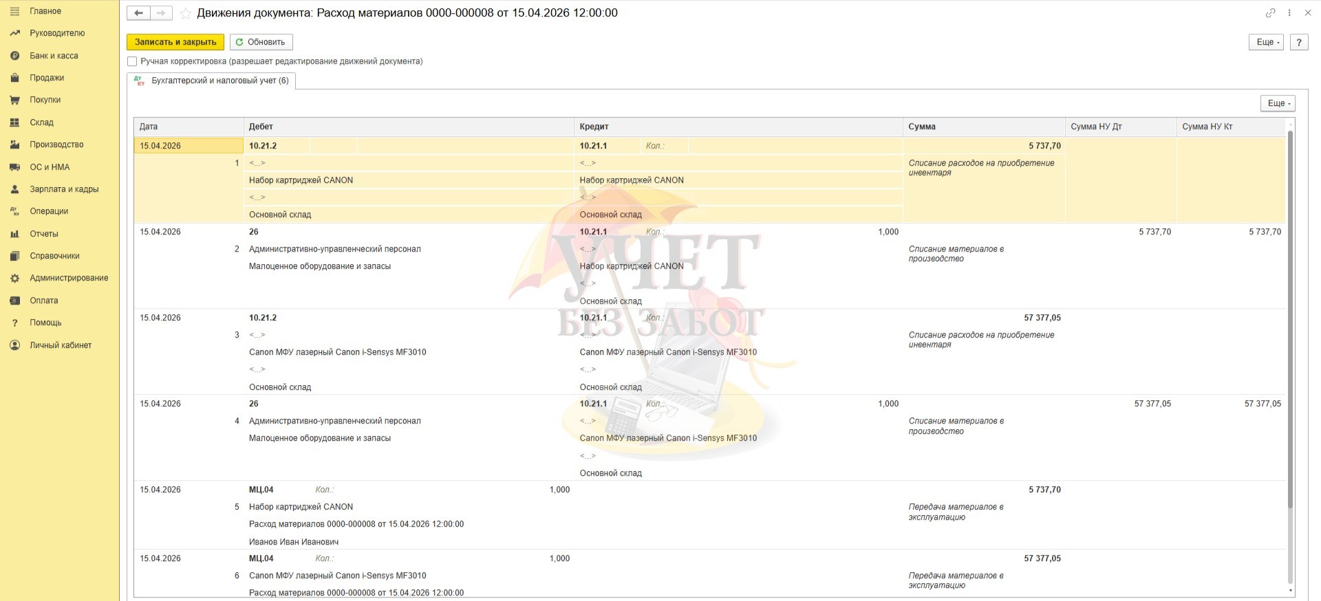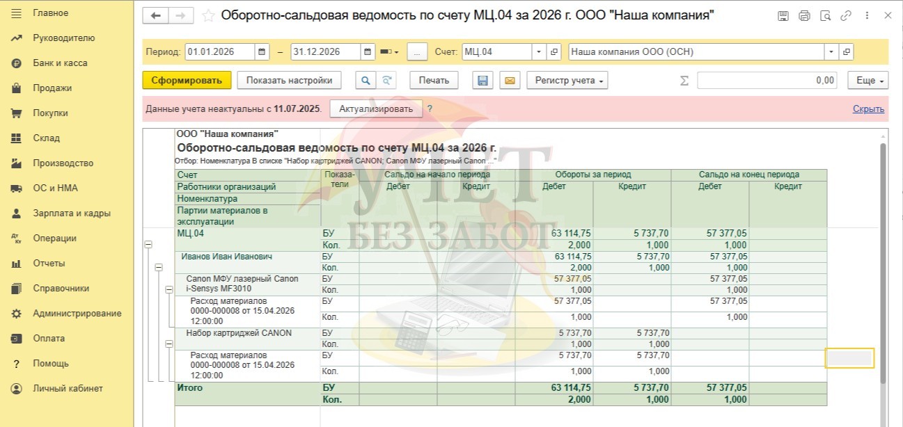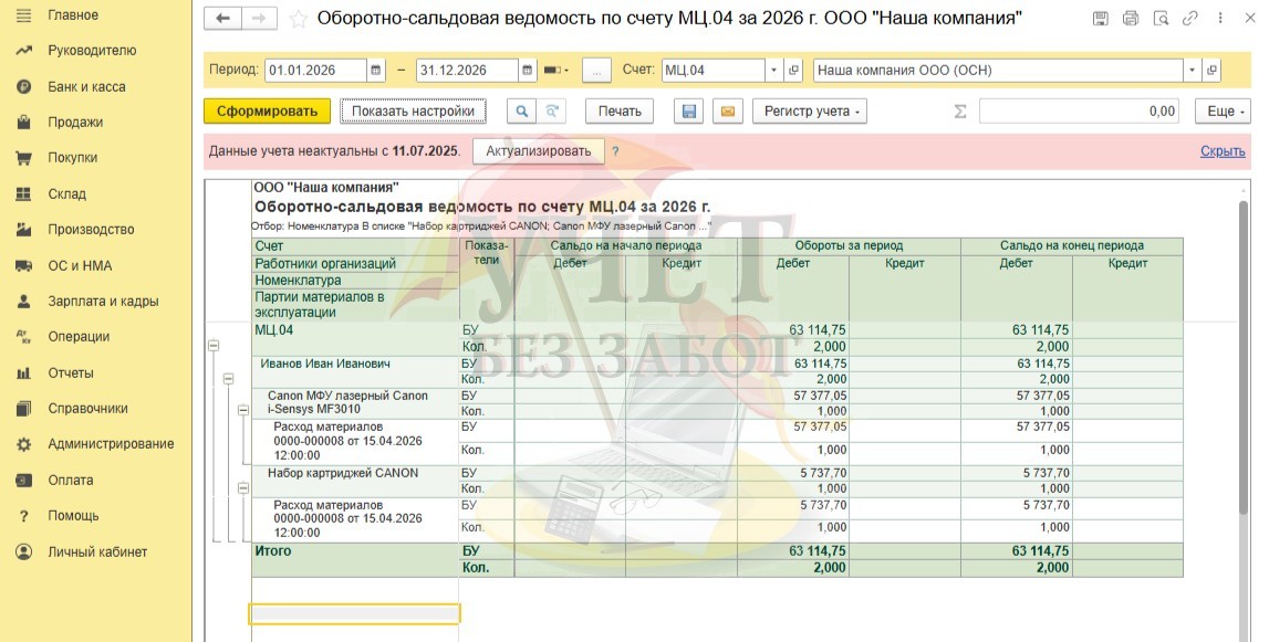 Теперь после проведения документа «Расход материалов» счет 10.21 полностью закрывается по субсчетам – и по количеству, и по сумме. Но, кроме этого, видим, что оборудование числится за сотрудником Ивановым И.И. на забалансовом счете МЦ.04.