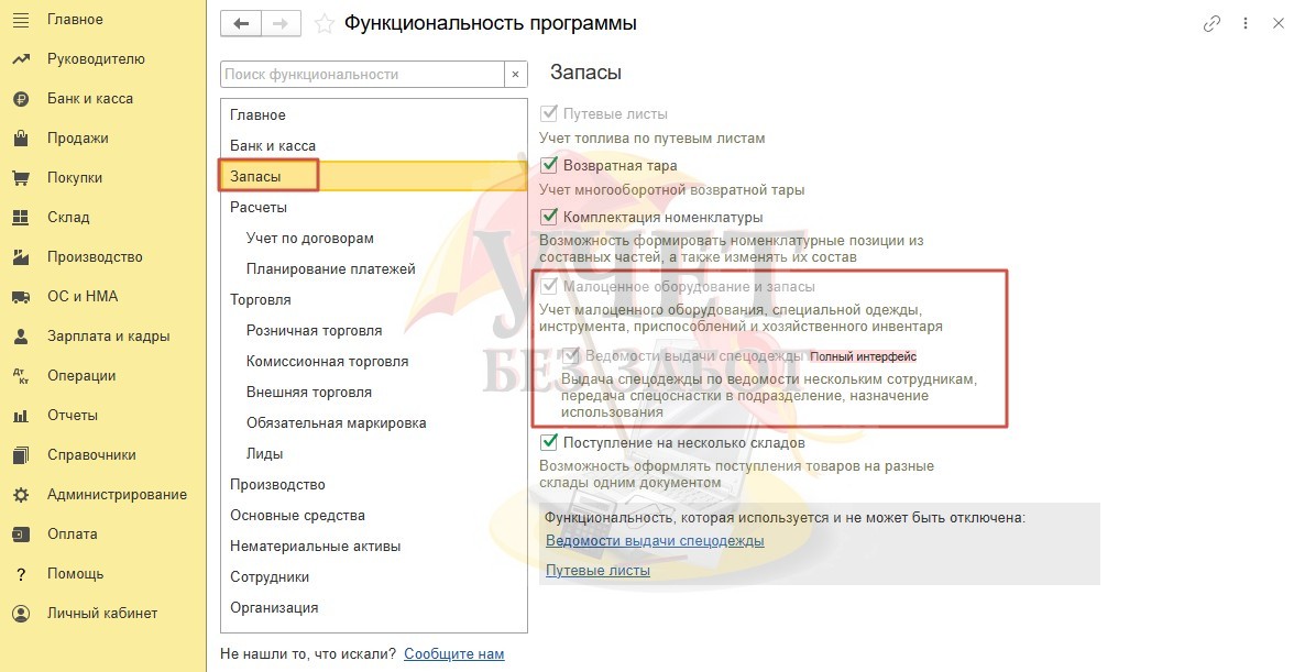 Отметим, что подраздел «Малоценное оборудование и запасы, выданные сотрудникам» появляется в карточке номенклатуры, если в разделе меню «Главное» - «Функциональность» - «Запасы» включены флаги «Малоценное оборудование и запасы», «Ведомости выдачи спецодежды».