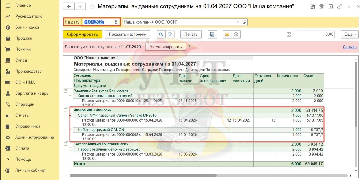Помимо этого, в разделе меню «Склад» - «Материалы, выданные сотрудникам» есть одноименный отчет, который можно сформировать на конкретную дату. В отличие от оборотно-сальдовой ведомости в данный отчет попадает информация о сроках использования (если необходимая информация была внесена в номенклатурной карточке в подразделе «Малоценное оборудование и запасы, выданные сотрудникам»).
