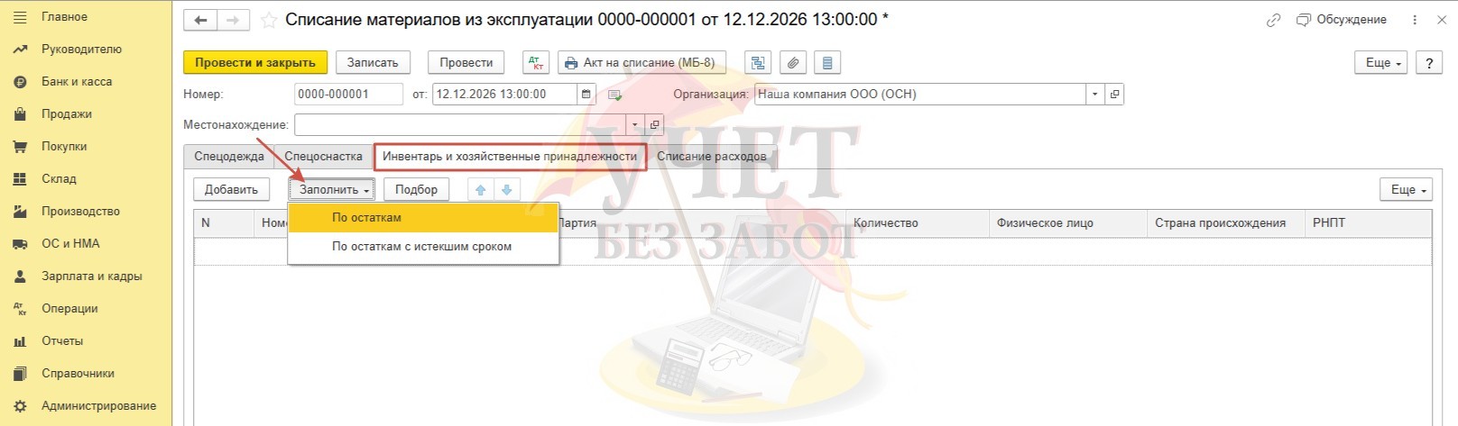 Перейдем на вкладку «Инвентарь и хозяйственные принадлежности». Нажмем на кнопку «Заполнить» и выберем необходимый вариант.