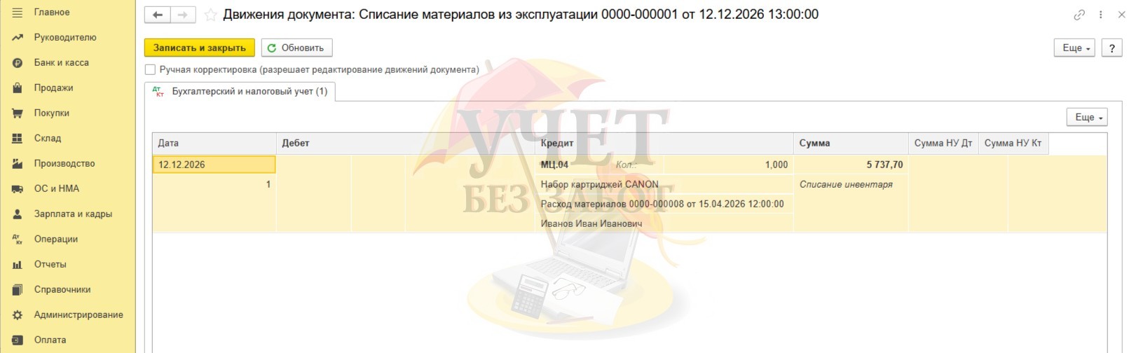 До момента проведения документа «Расход материалов» стоимость оборудования будет списана только по бухгалтерскому учету.