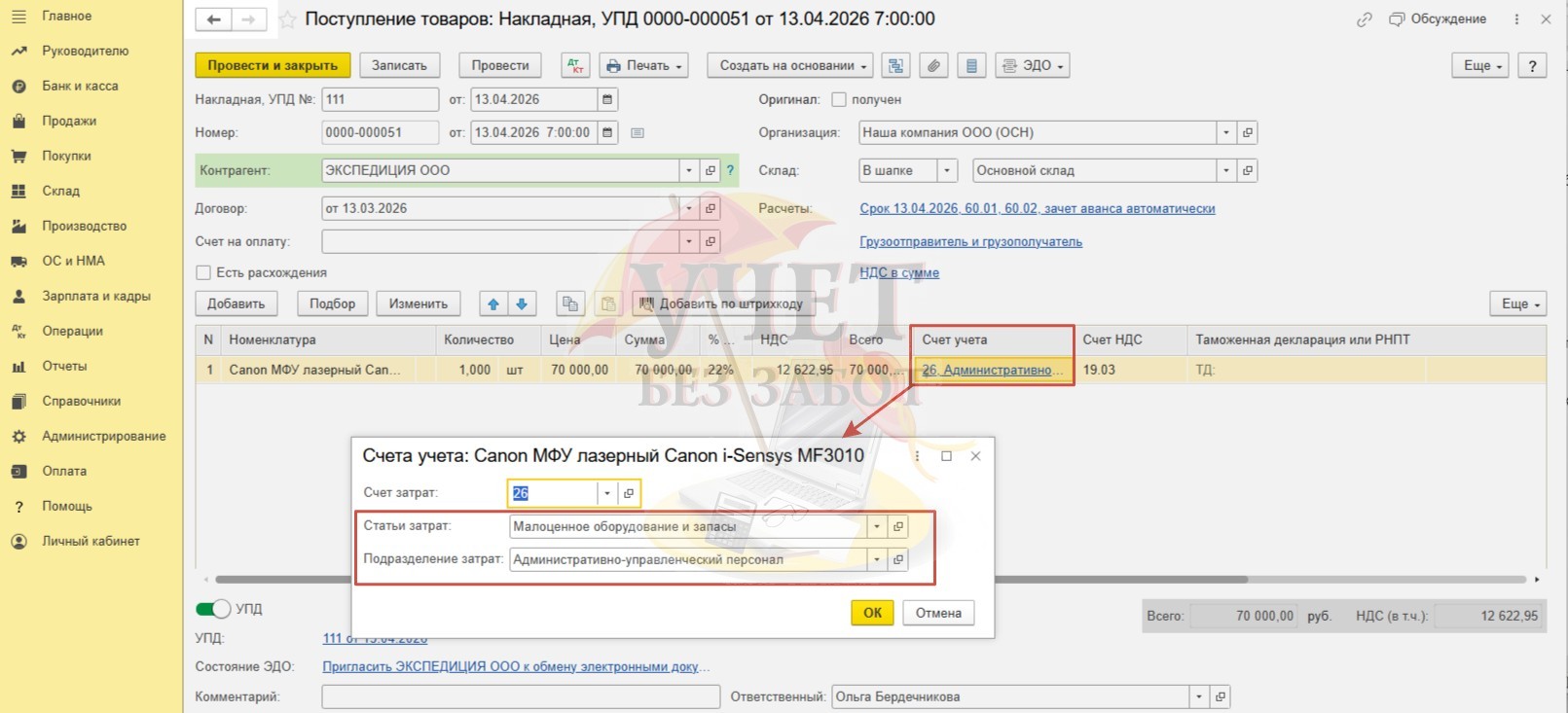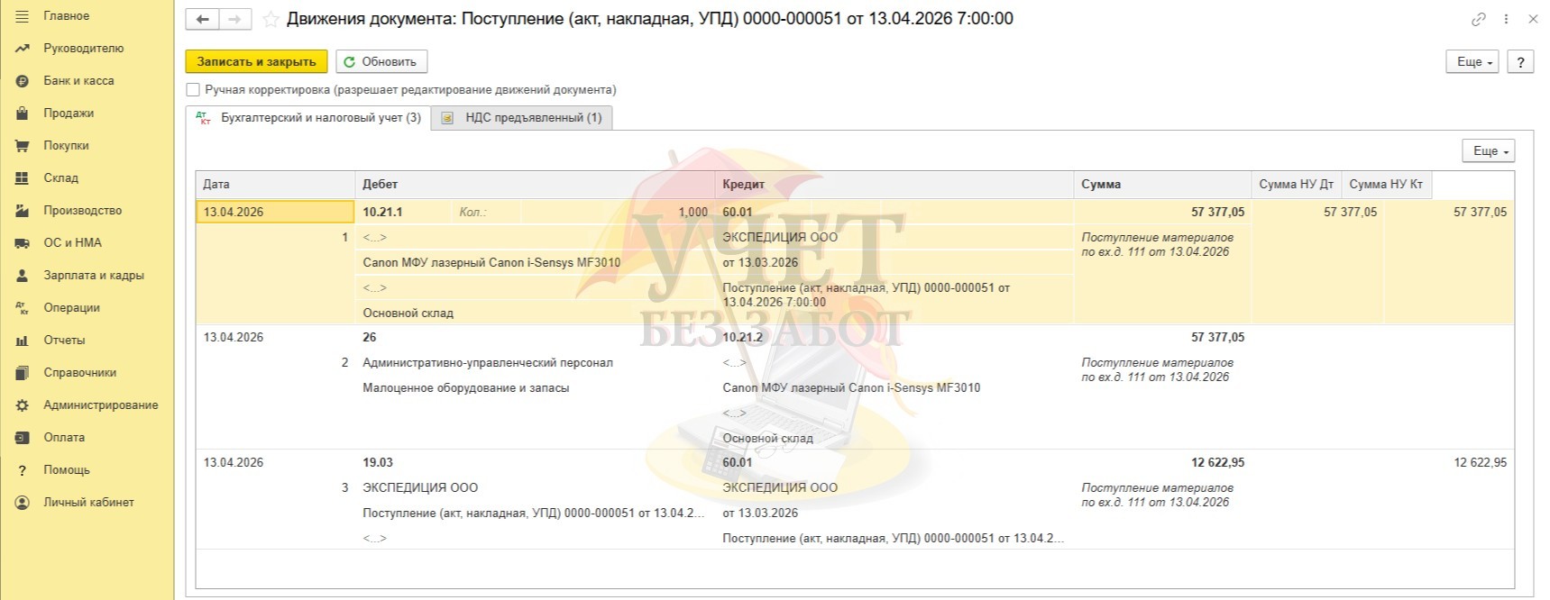 13.04.2026г – приобретено МФУ стоимостью 70 000 руб. (в т.ч. НДС – 12 622 руб. 95 коп.);