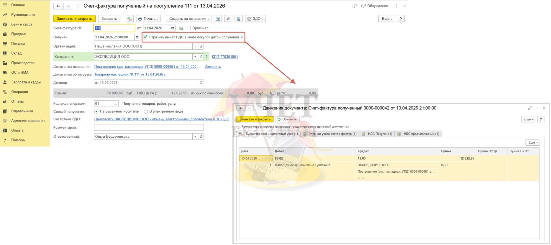 Вычет по НДС при приобретении малоценного оборудования в программе производится без каких-либо особенностей. Если в документе «Счет-фактура полученный на поступление» установлен флаг «Отразить вычет НДС в книге покупок датой получения», программой будет сформирована проводка Дт 68.02 Кт 19.03.