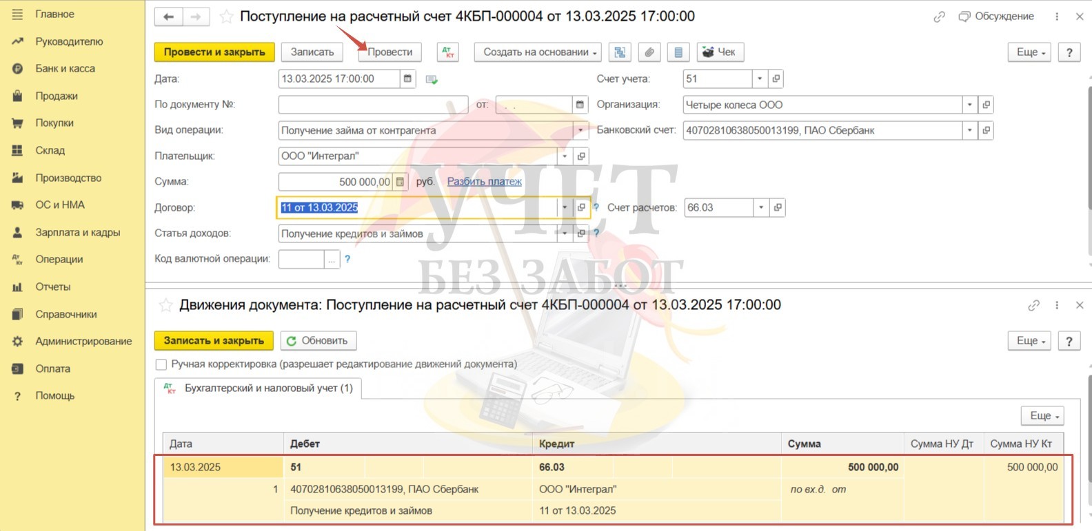 Обратите внимание, что счет расчетов 66.03, который применяется для учёта краткосрочных займов, установлен автоматически. Программа сама определила корректный счет, поскольку в карточке договора мы указали срок его действия – до 30.04.2025 г.