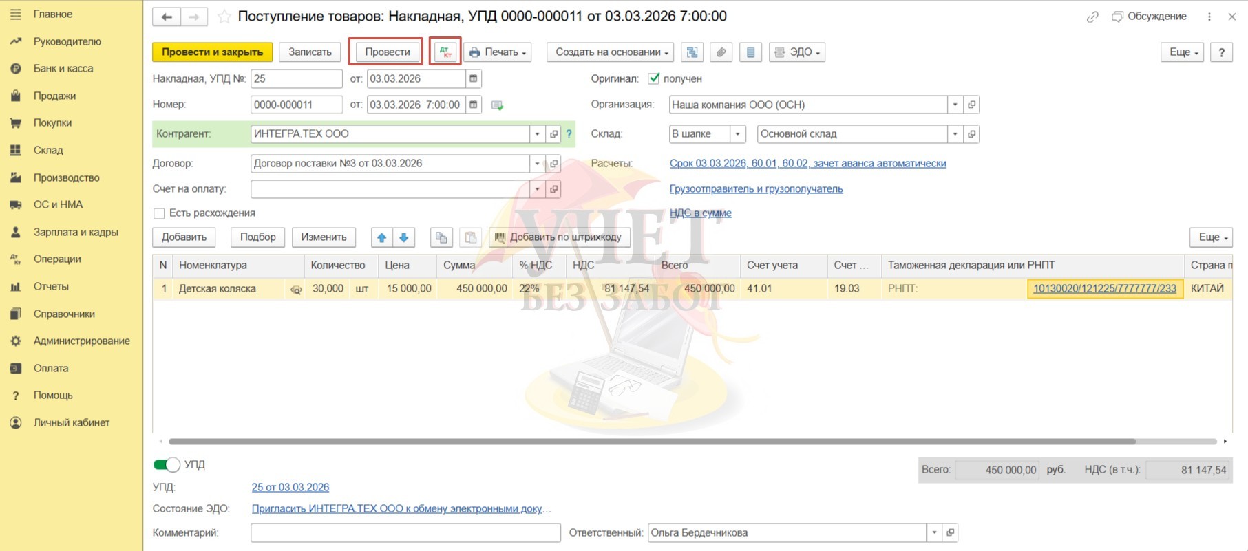 Установим переключатель «УПД» для регистрации счета-фактуры и применения вычета по НДС. Далее проведем документ и по кнопке