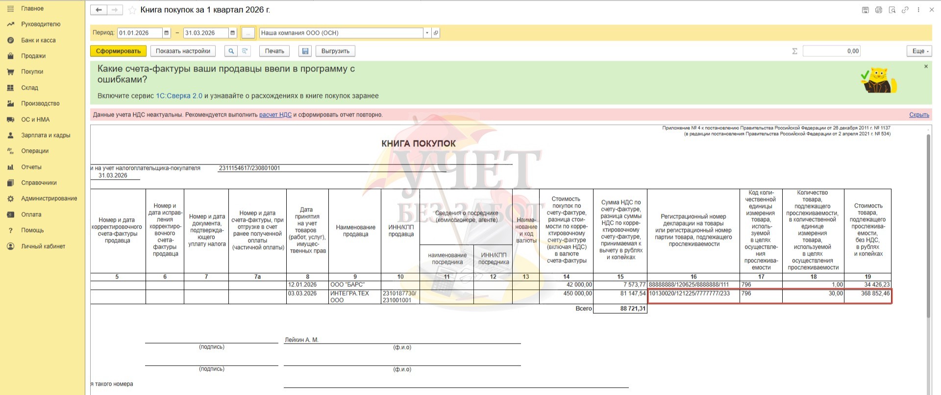 Давайте перейдем в раздел меню «Отчеты» - «Книга покупок». Мы должны удостовериться, что данные о прослеживаемом товаре корректно отражены в книге покупок. Сформируем отчет за первый квартал. Реквизиты прослеживаемости успешно отражены в графах 16-19.