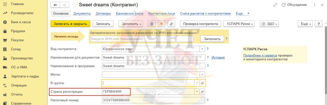 В карточке организации проконтролируем заполнение строки «Страна регистрации». В нашем примере – это Германия.