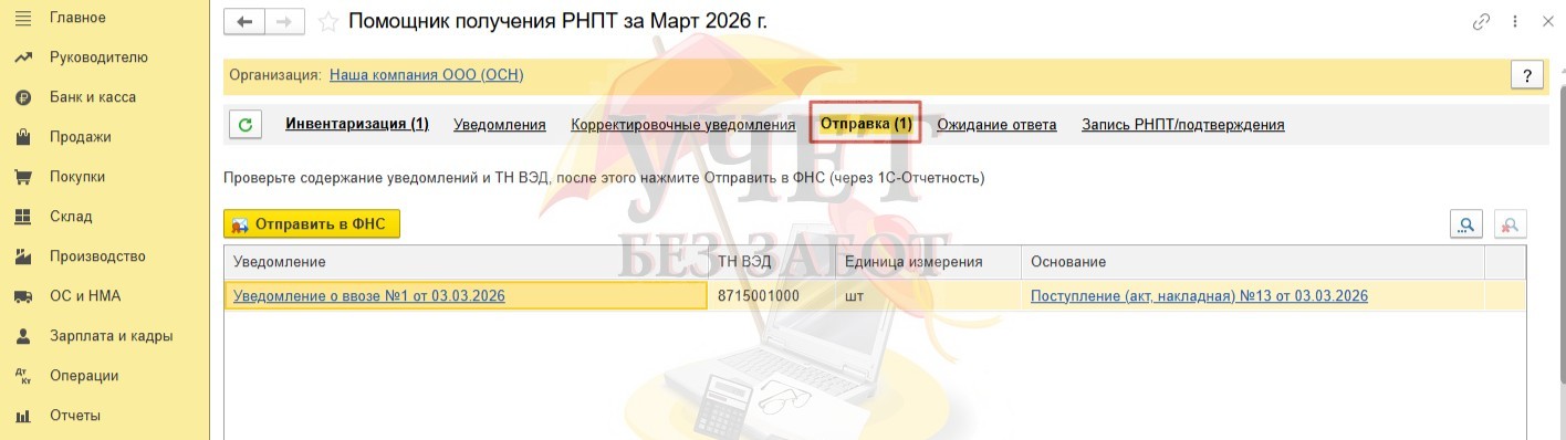 Если же в программе 1С: Бухгалтерия предприятия ред. 3.0 подключен сервис «1С-Отчетность», то требуется лишь нажать на кнопку «Отправить в ФНС» и уведомление будет отправлено.