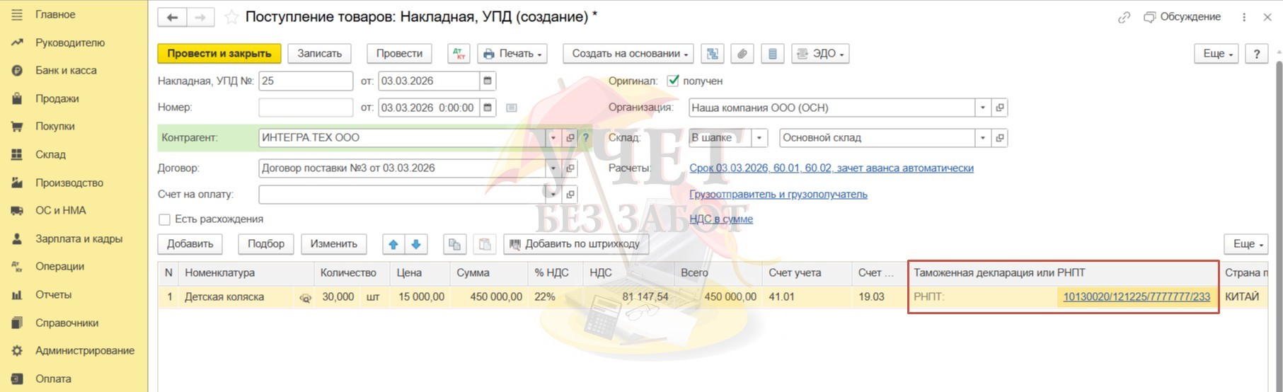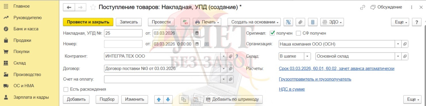 На основании полученных документов от поставщика, в нашем примере это УПД № 25 от 03.03.26г., заполняем «шапку» документа.