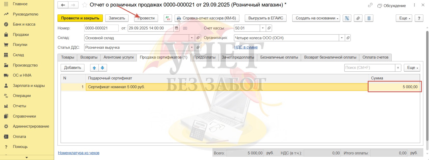 Укажем сумму продажи сертификата. При оплате наличными заполнение других вкладок не требуется. Проведём документ.