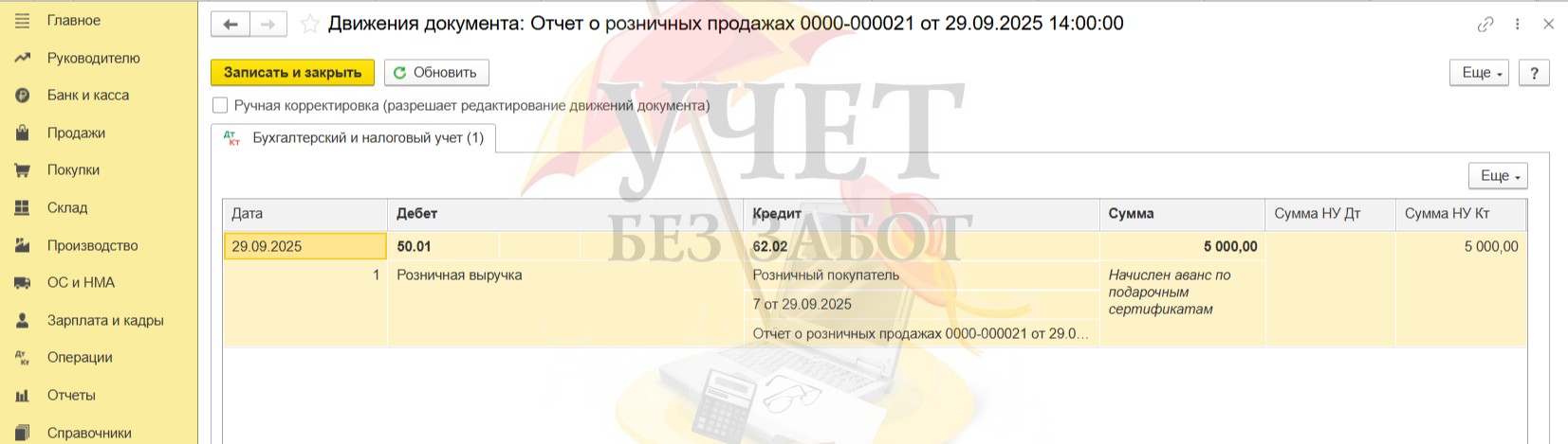 Алгоритм действий при продаже подарочных сертификатов в розничной торговле при ОСН в 1С: Бухгалтерии предприятия ред. 3.0