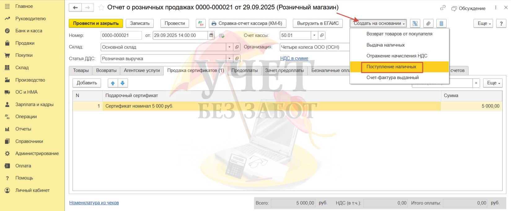 Для завершения документального оформления зарегистрируем документ «Поступление наличных» в программе на основании отчета о розничных продажах.