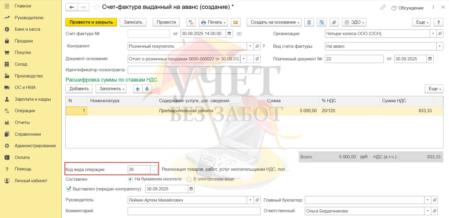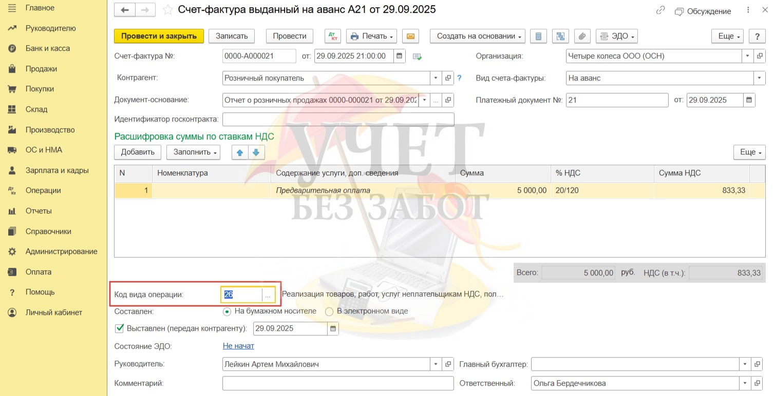 Программа по умолчанию устанавливает код вида операции «02». При получении предоплаты от физлиц, которые не являются плательщиками НДС, рекомендуется использовать код «26». Изменим данное значение вручную.
