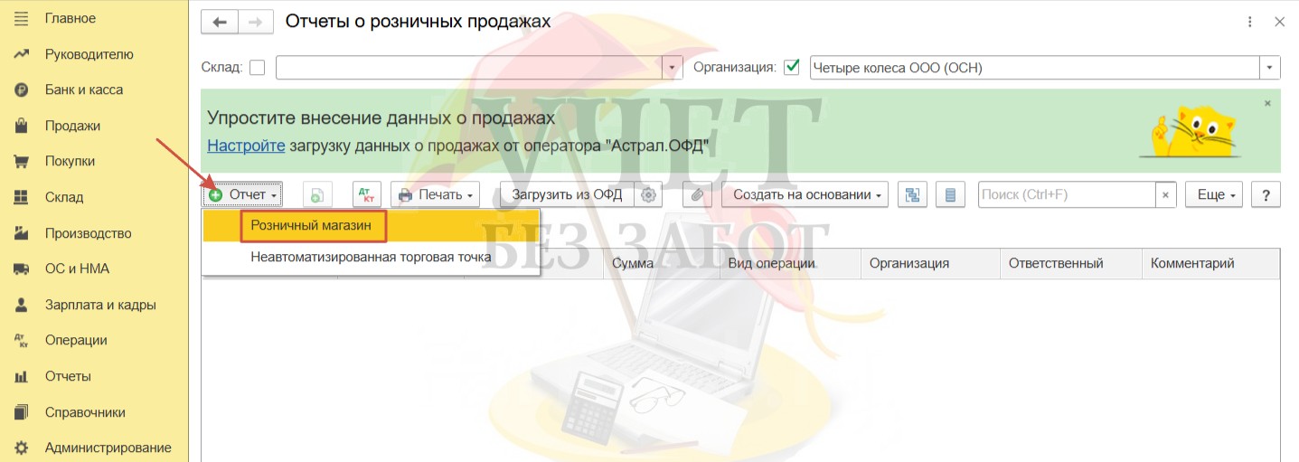 Вернёмся в раздел меню «Продажи» - «Отчеты о розничных продажах» и создадим еще один отчет с видом «Розничный магазин».