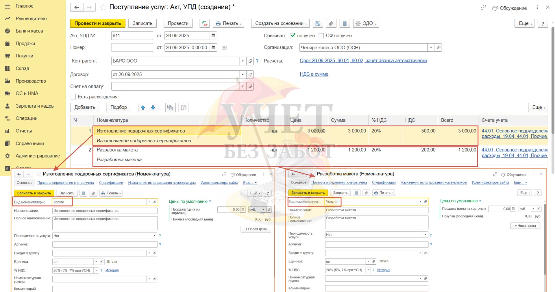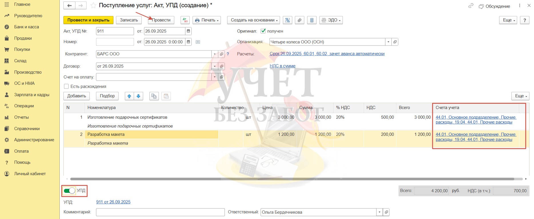 В поле «Счет учета» выберем счет, на который будут отнесены затраты на изготовление сертификатов. Установим переключатель «УПД» и проведём документ.