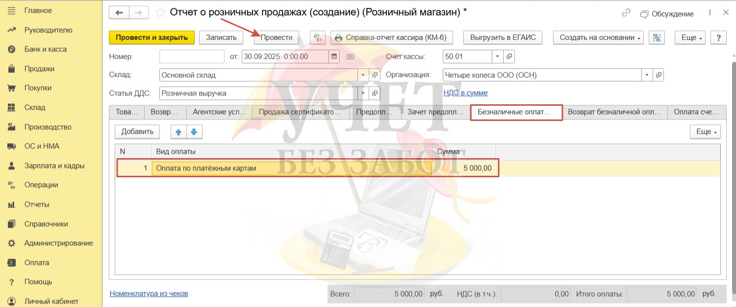 При этом проводка в Дебет счета 50.01 была сформирована при проведении отчета о розничных продажах, поэтому на этом этапе программа не регистрирует движений по проводкам.