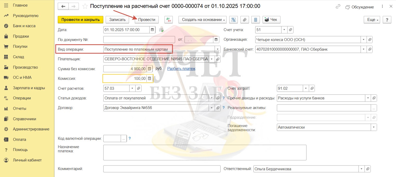 Далее отразим поступление на расчётный счет суммы, оплаченной по карте. В разделе меню «Банк и касса» - «Банковские выписки» создадим новый документ «Поступление на расчетный счет». Обратите внимание на корректный вид операции «Поступление по платежным картам». В поле «Сумма без комиссии» следует указать сумму оплаты по платежной карте за минусом комиссии, а в поле «Комиссия» - сумму комиссии, которую банк-эквайер удерживает за проведение операции. Проведём документ.