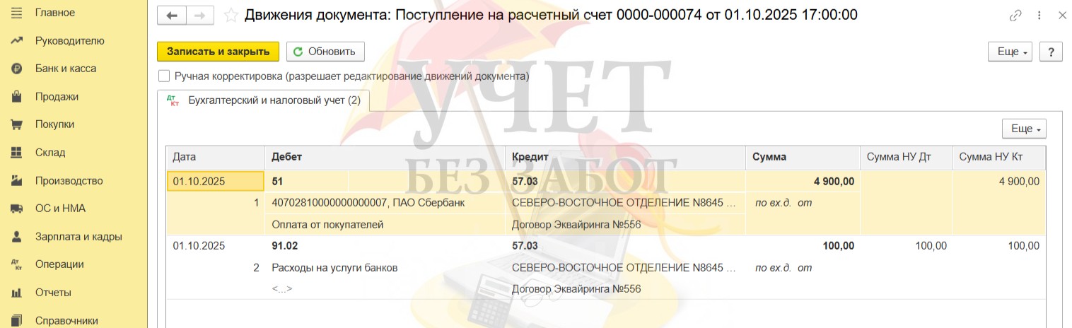 01.10.2025 – оплата поступила от банка-эквайера на расчётный счёт организации.