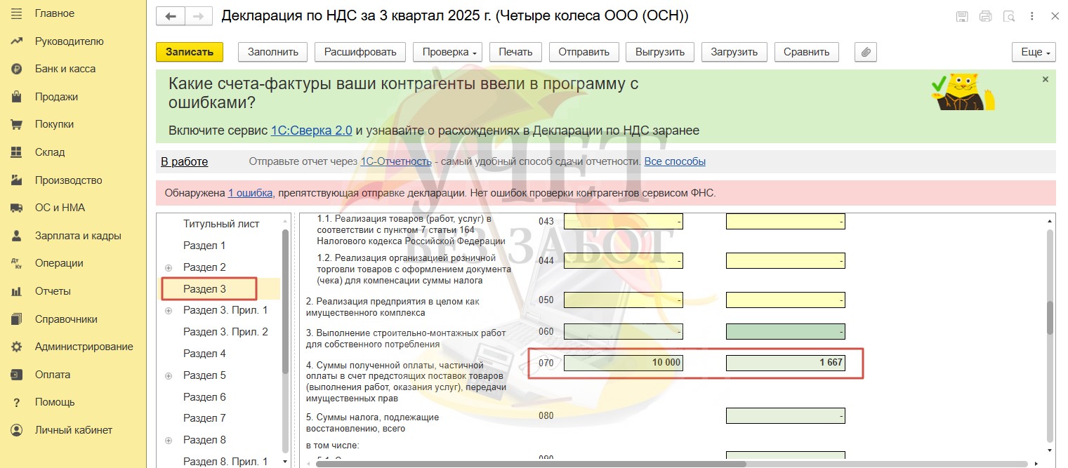 Сформируем в разделе «Отчеты» - «Регламентированные отчеты» декларацию по НДС за 3 квартал. Сумма аванса, полученного в форме наличной и безналичной оплаты, а также НДС, исчисленный с указанных сумм, отражаются по строке 070 раздела 3.