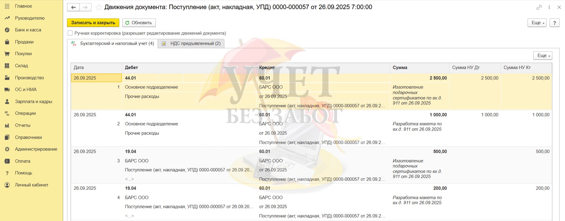 26.09.2025 – организация получила от поставщика сертификаты в количестве 50 штук; ООО «БАРС» представил закрывающие документы на сумму 4 200 руб. (в т.ч. НДС – 700 руб.);