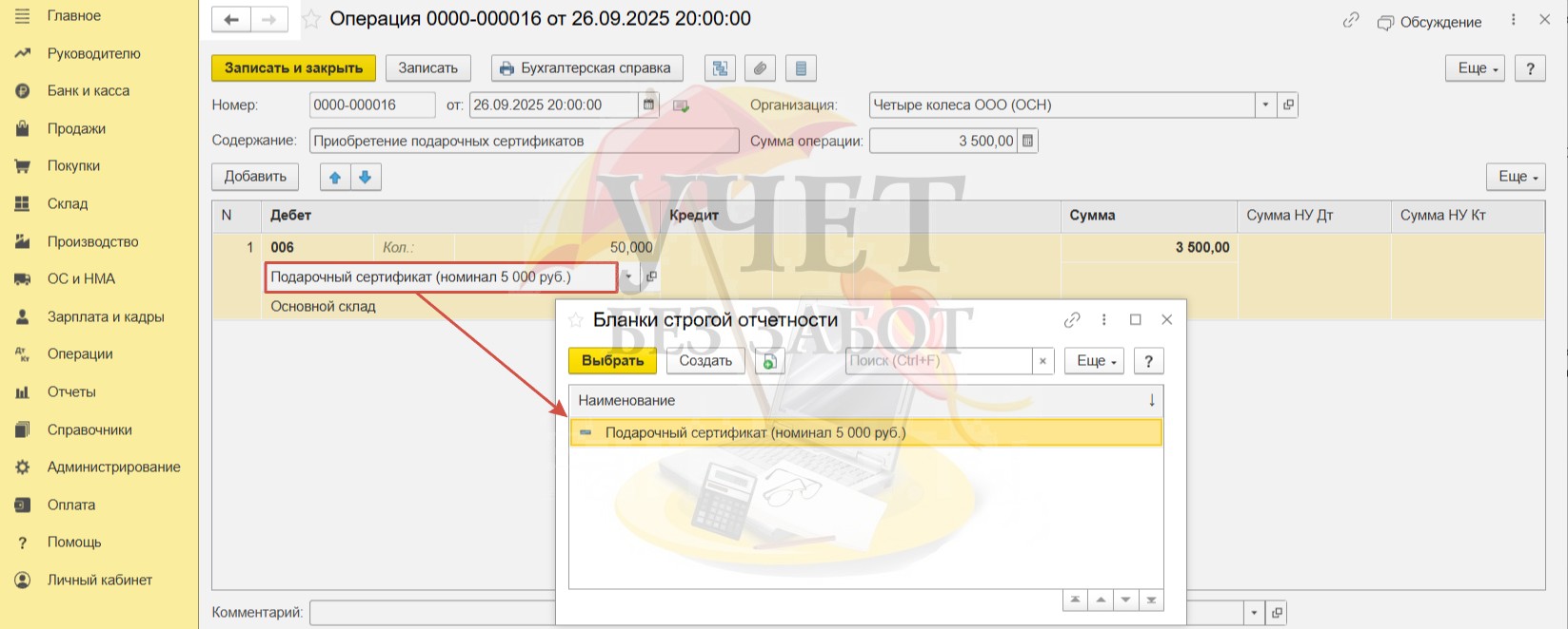 По Дебету будем использовать забалансовый счет 006 «Бланки строгой отчетности». Для детализации информации в качестве субконто запишем новый элемент «Подарочный сертификат (номинал 5 000 руб.)» в справочнике «Бланки строгой отчетности» и ниже выберем склад. Укажем количество приобретённых сертификатов и их стоимость без учёта НДС. Для сохранения данных в программе нажмём «Записать и закрыть».