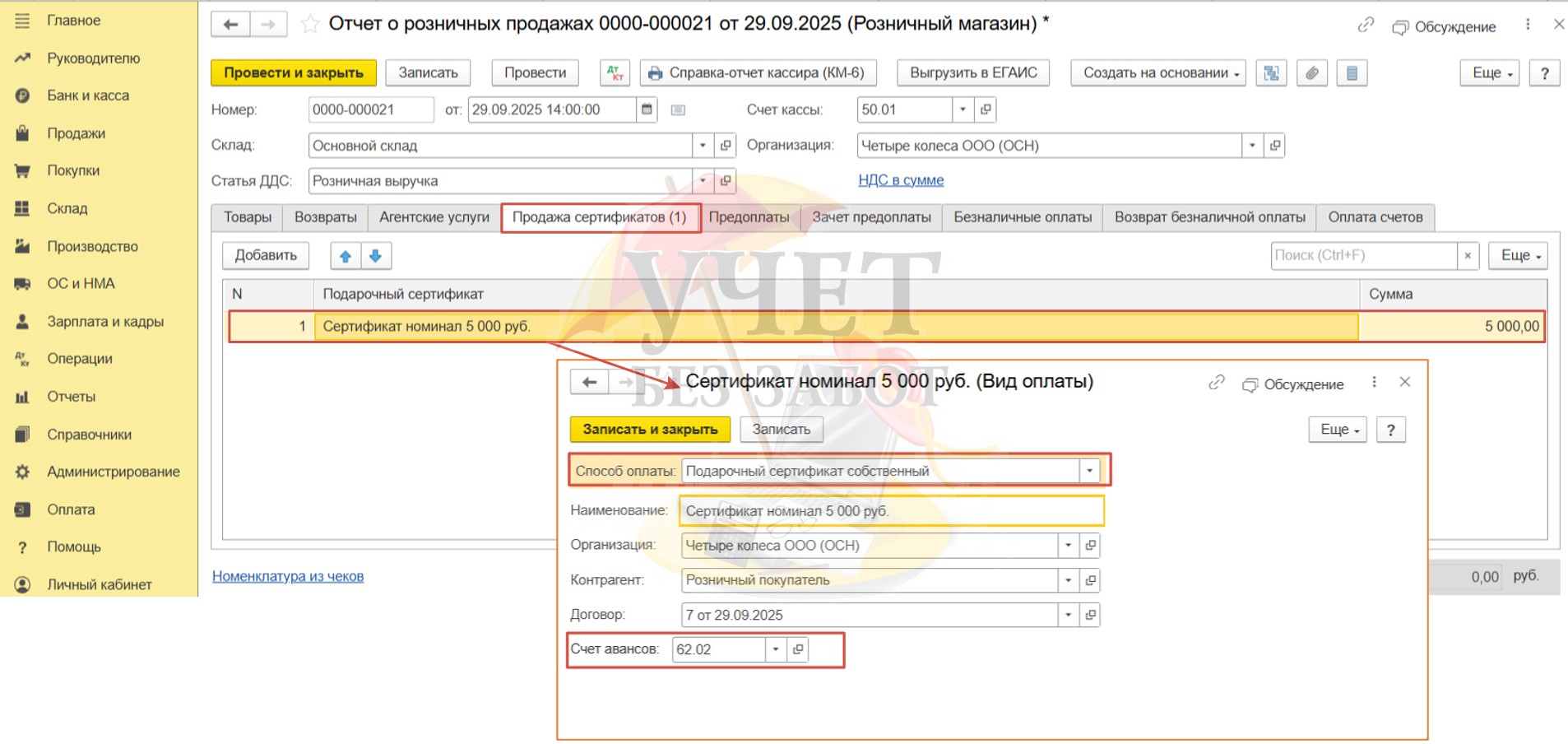 Перейдем на вкладку «Продажа сертификатов» и снова добавим вид оплаты «Сертификат номинал 5 000 руб.», который мы создавали ранее (Шаг 4). Укажем сумму продажи.