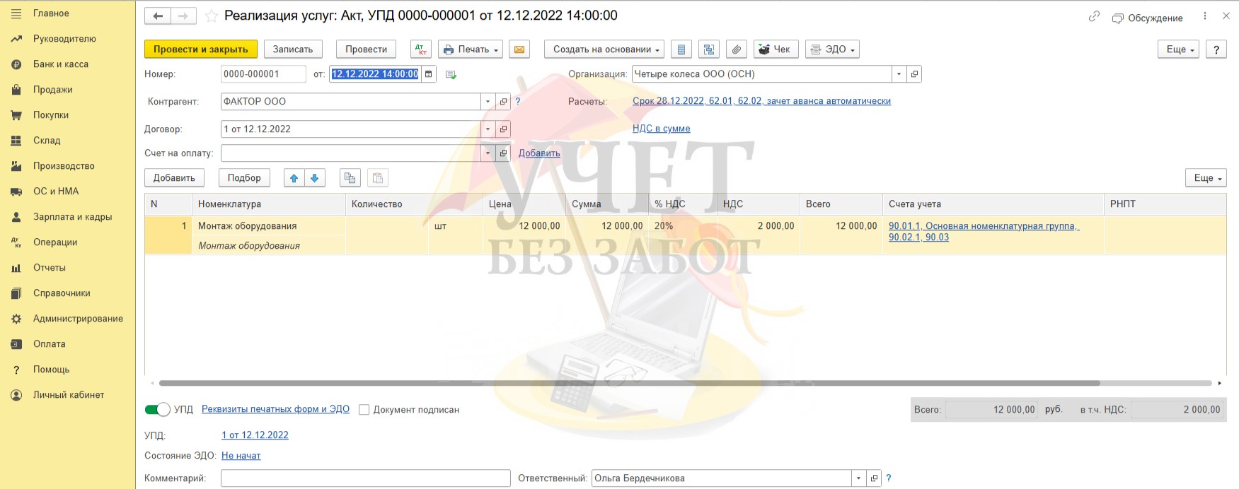 Факт отгрузки услуг был зарегистрирован в программе 12.12.2022 г документом «Реализация» с видом «Услуги (акт, УПД)» в разделе меню «Продажи» - «Реализация (акты, накладные, УПД)».