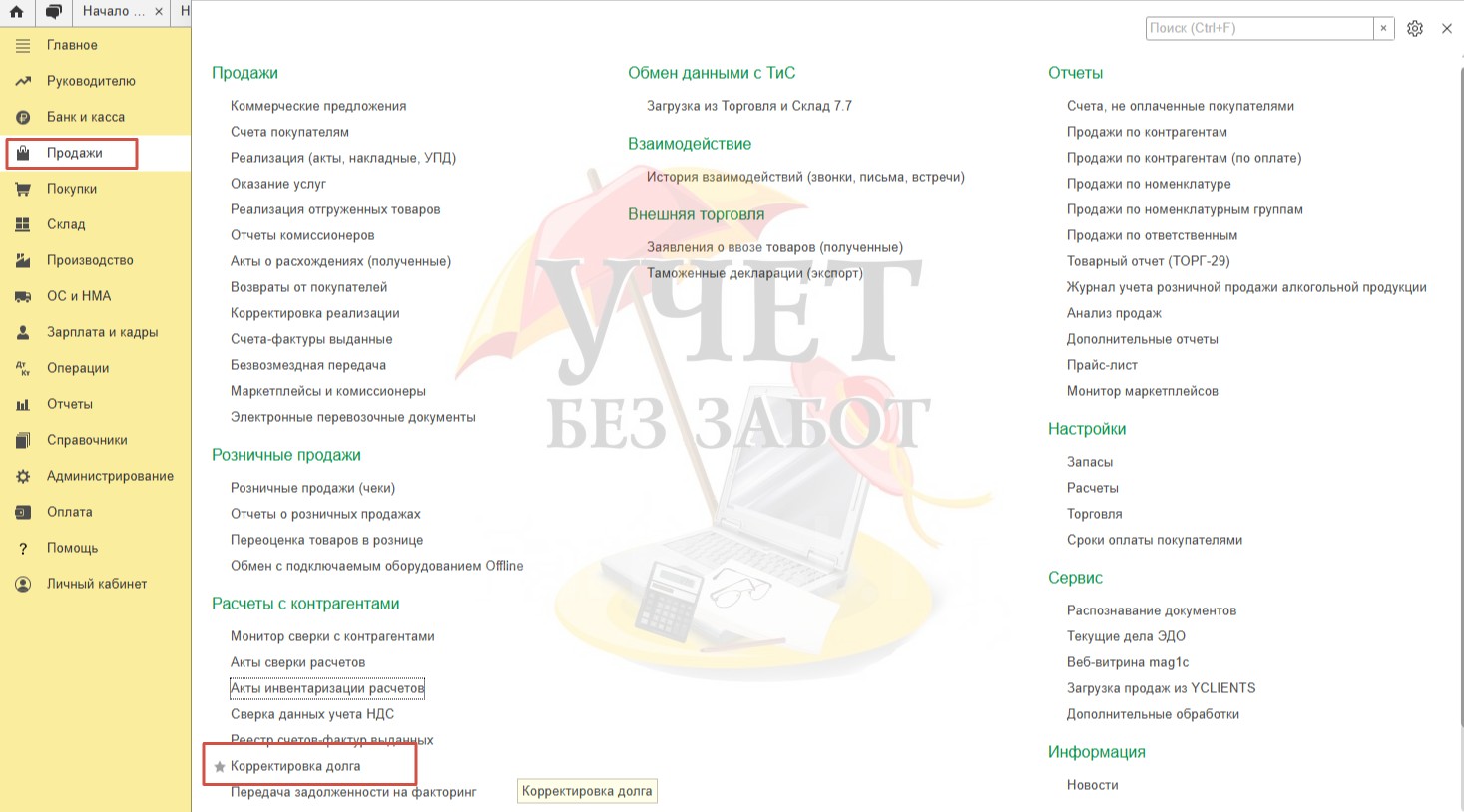 Перейдем в раздел меню «Продажи» - «Корректировка долга».