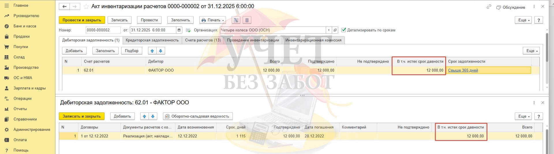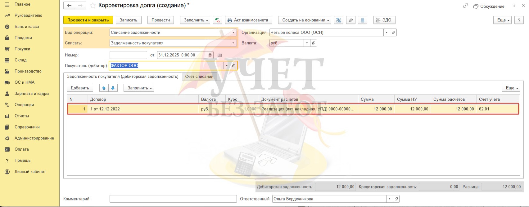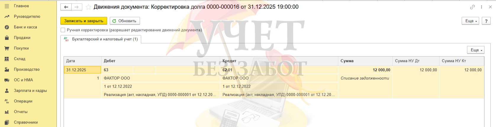 31.12.2025 г. была проведена инвентаризация расчетов, в ходе которой задолженность ООО «ФАКТОР» в размере 12 000 руб. была признана безнадёжной по причине истечения срока давности. В связи с этим был подписан приказ о списании дебиторской задолженности. Описанные действия требуется отразить в программе.
