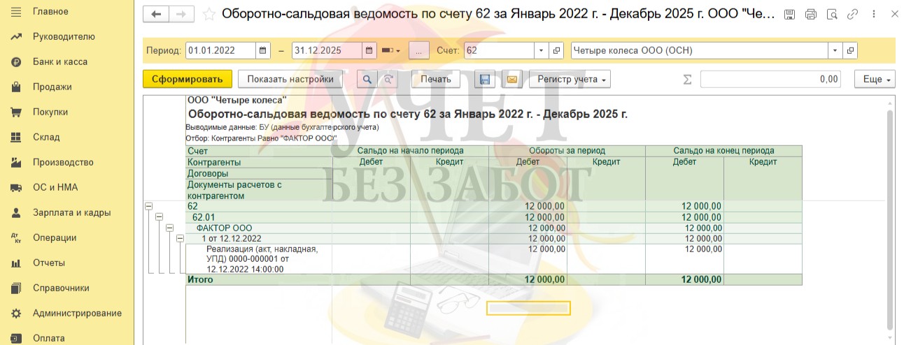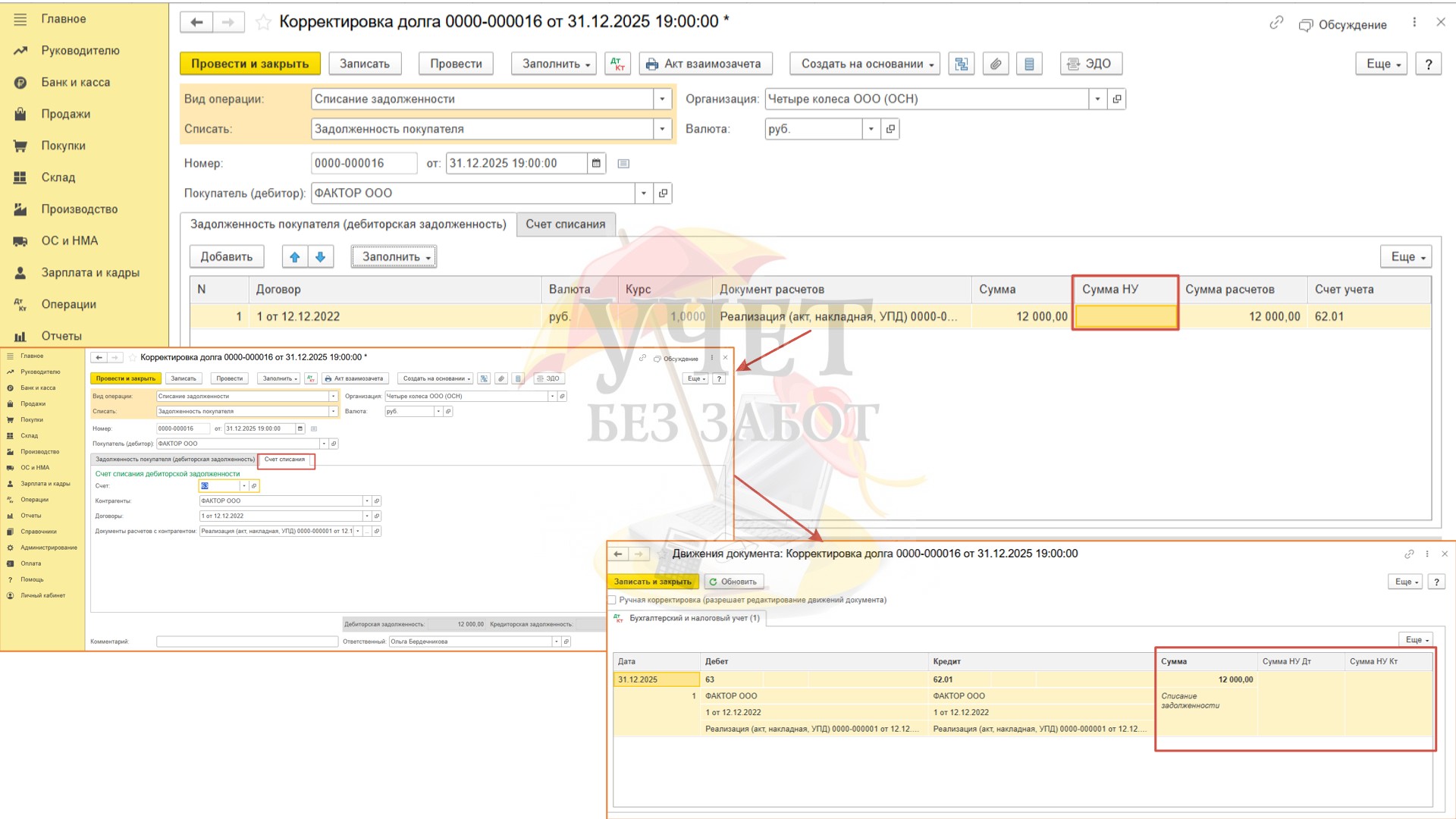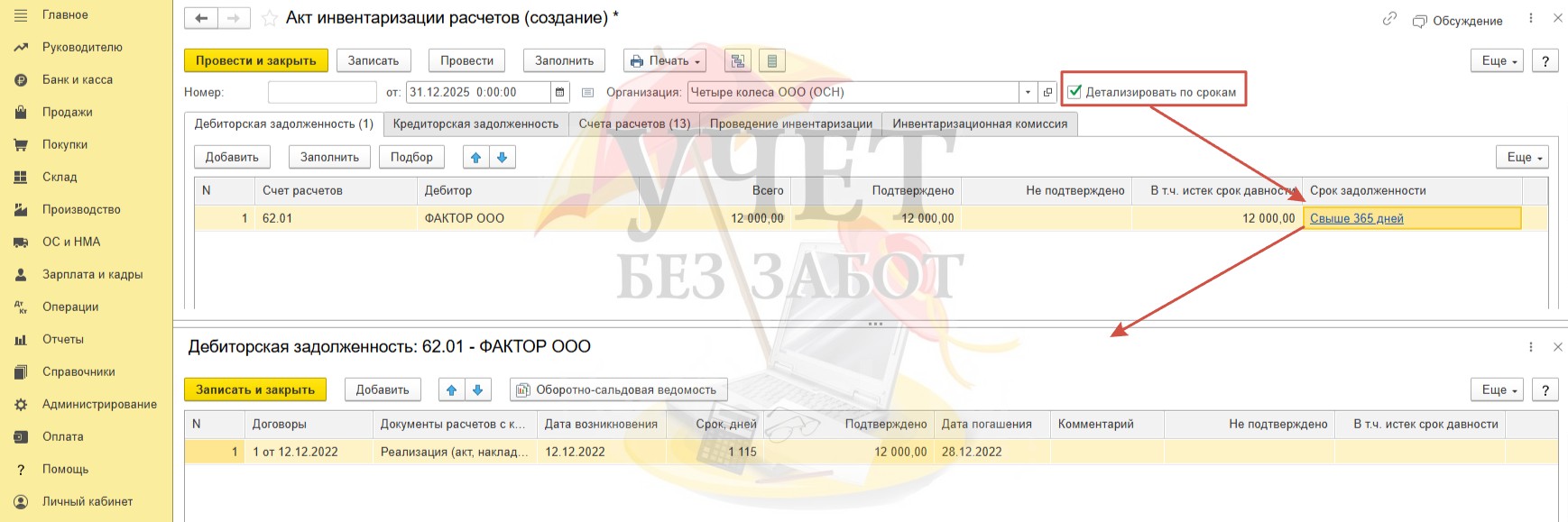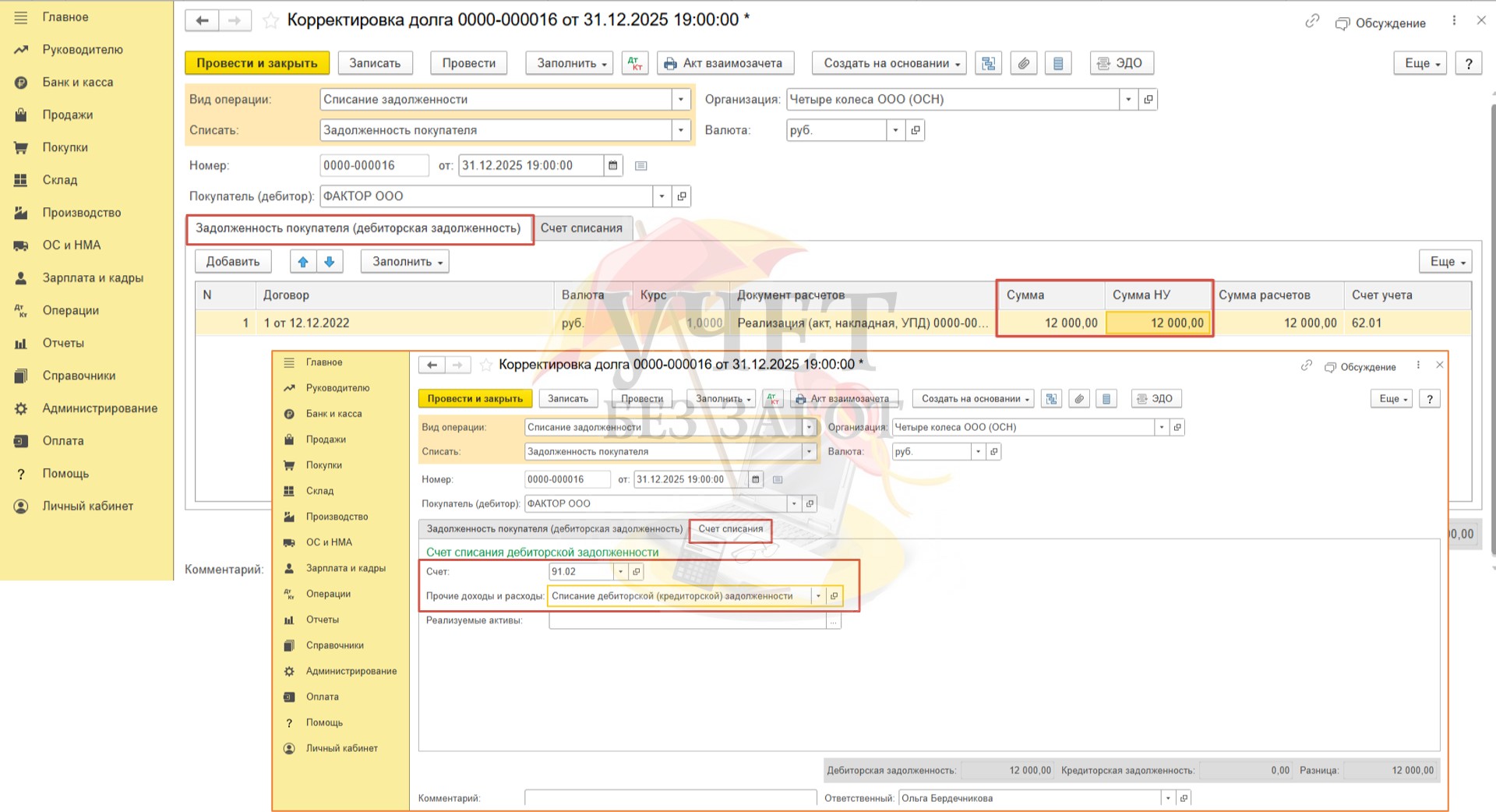 31.12.2025 г. была проведена инвентаризация расчетов, в ходе которой задолженность ООО «ФАКТОР» в размере 12 000 руб. была признана безнадёжной по причине истечения срока давности. В связи с этим был подписан приказ о списании дебиторской задолженности. Описанные действия требуется отразить в программе.
