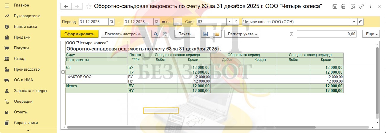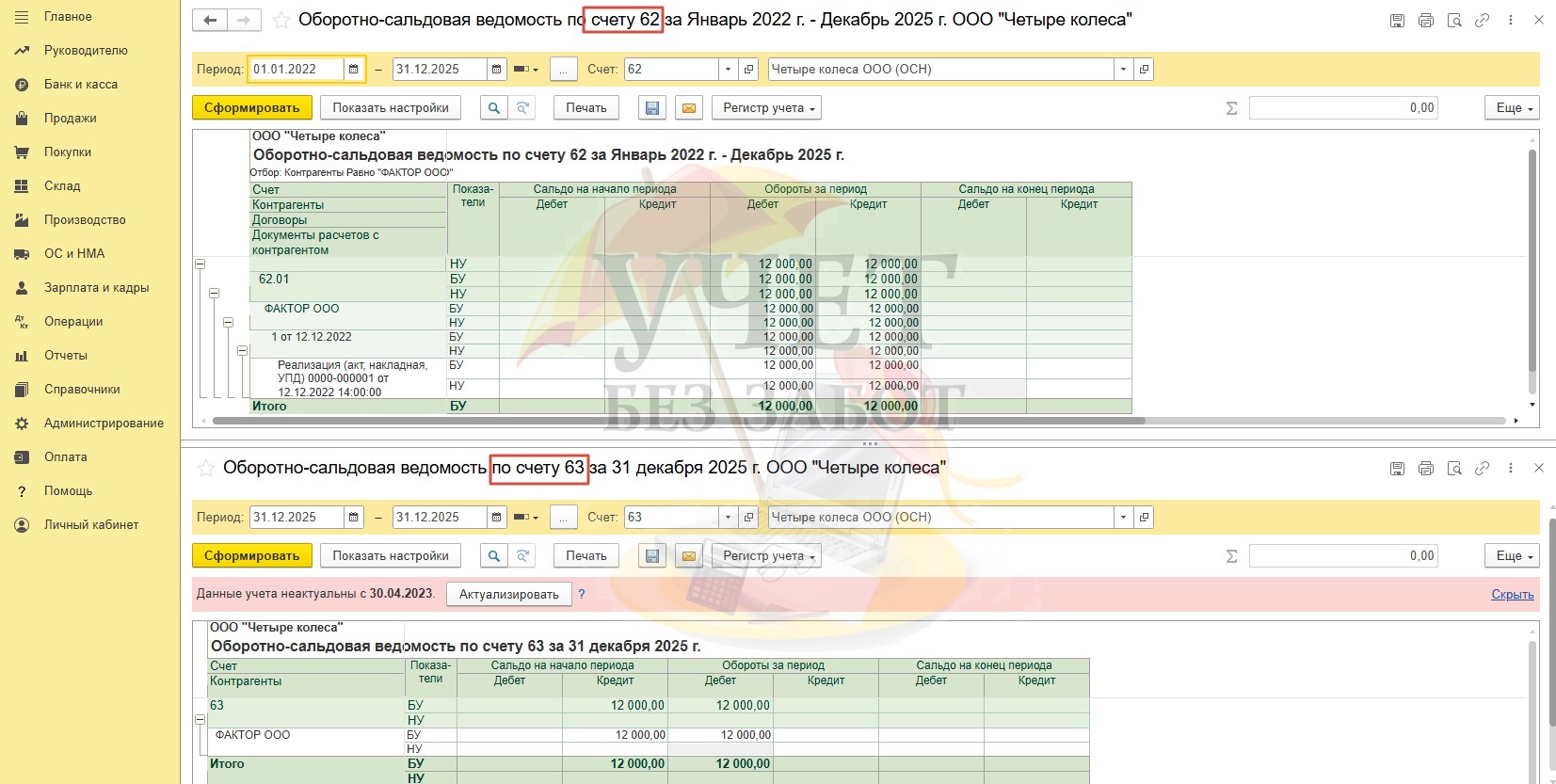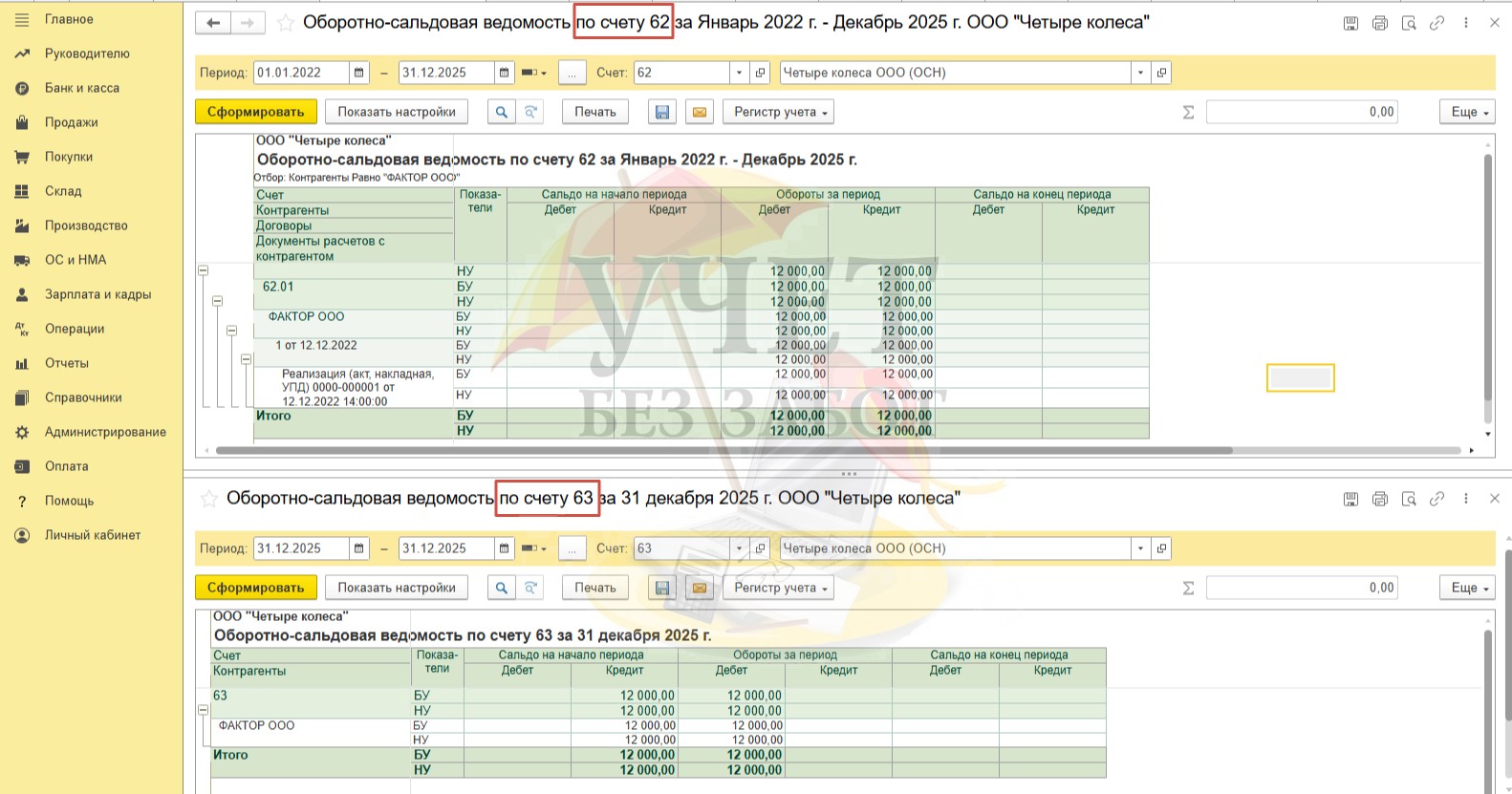 Для контроля проведённых действий необходимо сформировать оборотно-сальдовую ведомость по счету 62 и 63 с отражением показателей бухгалтерского и налогового учета. Сальдо отсутствует, операции проведены корректно.