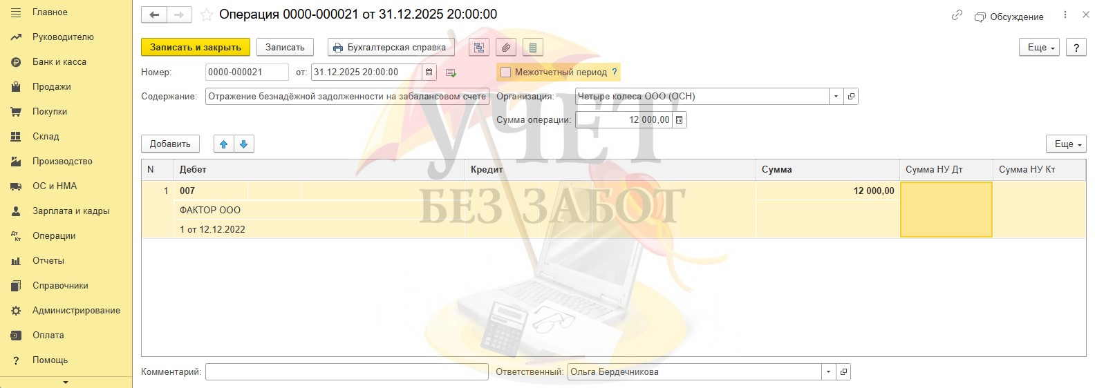 Шаг 3 – Отражение безнадёжной задолженности на забалансовом счете