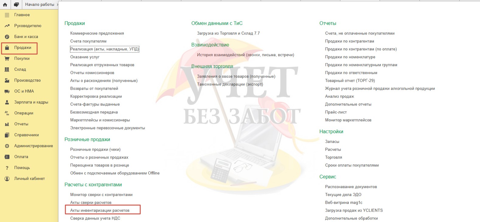 Для отражения факта проведения инвентаризации воспользуемся документом «Акт инвентаризации расчетов» в разделе меню «Продажи» - «Акты инвентаризации расчетов».