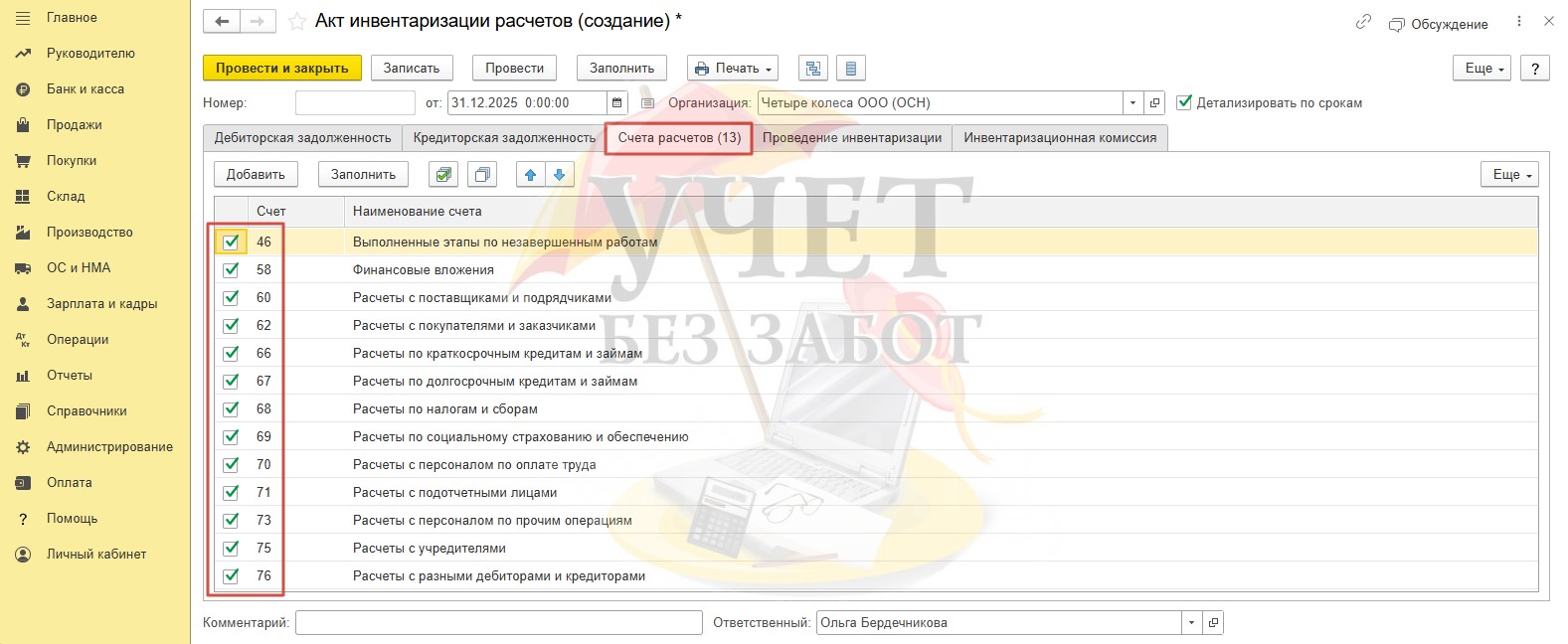Перед тем как перейти к заполнению документа, на вкладке «Счета расчетов» можно выбрать конкретные счета. По умолчанию в документ попадают данные по всем счетам расчетов.