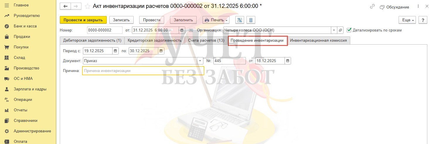 На вкладке «Проведение инвентаризации» указывается дополнительная информация об инвентаризации - причины и сроки проведения, документ, инициирующий процедуру.