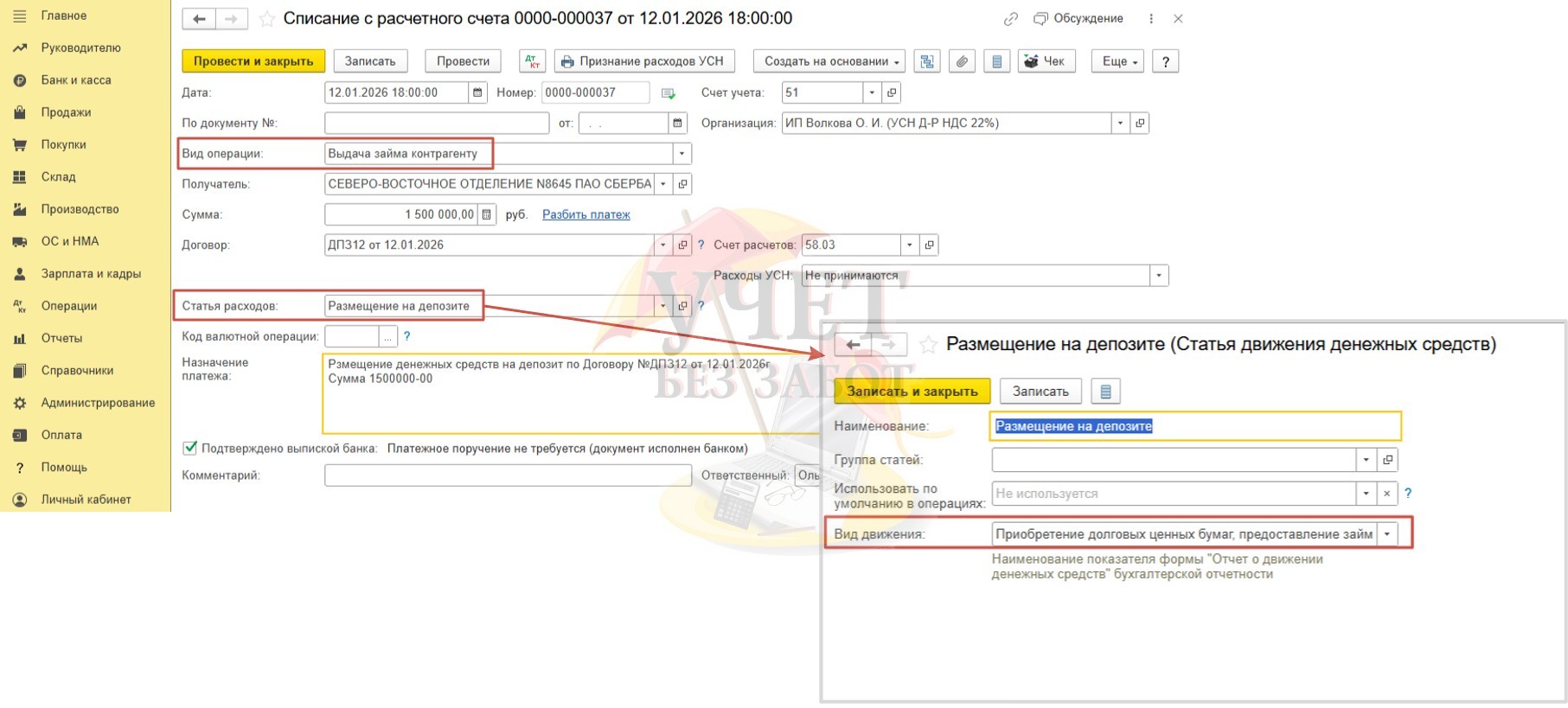 Условия примера: ИП Волкова О.И. применяет упрощенную систему налогообложения с объектом «доходы минус расходы». Предприниматель открыла депозит в банке на сумму 1 500 000 руб. Договор заключен на срок с 12.01.2026 по 11.06.2026г. В соответствии с договором выплата процентов осуществляется единовременно в день возврата депозитной суммы на расчетный счет предпринимателя. Учетной политикой ИП предусмотрено, что денежные средства, размещенные на депозите на срок более 3х-месяцев учитываются в качестве финансовых вложений (на счете 58).