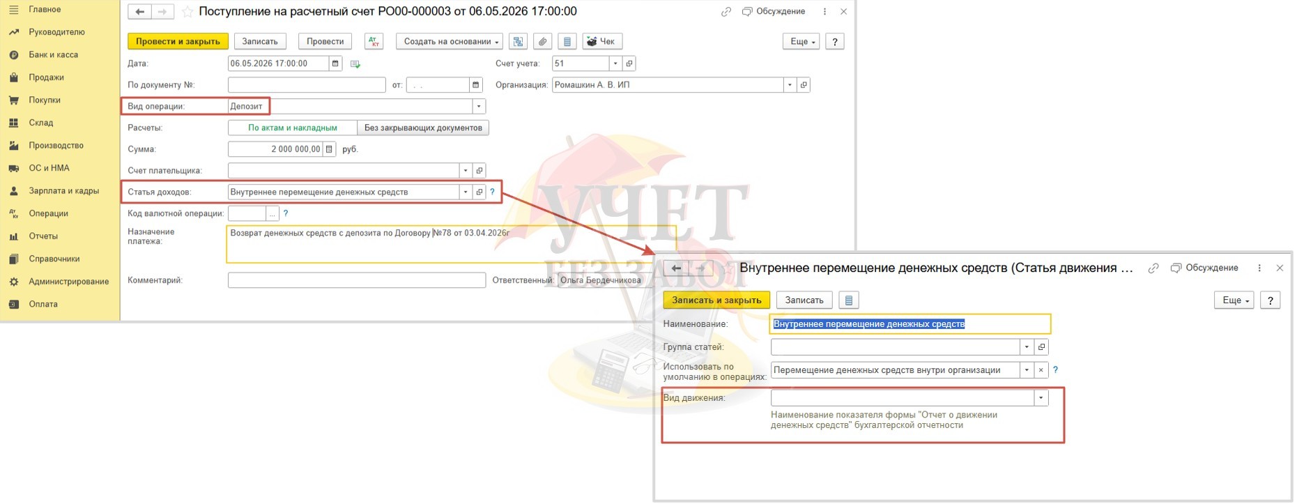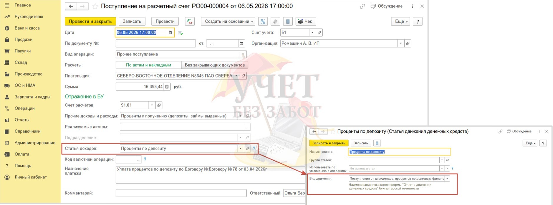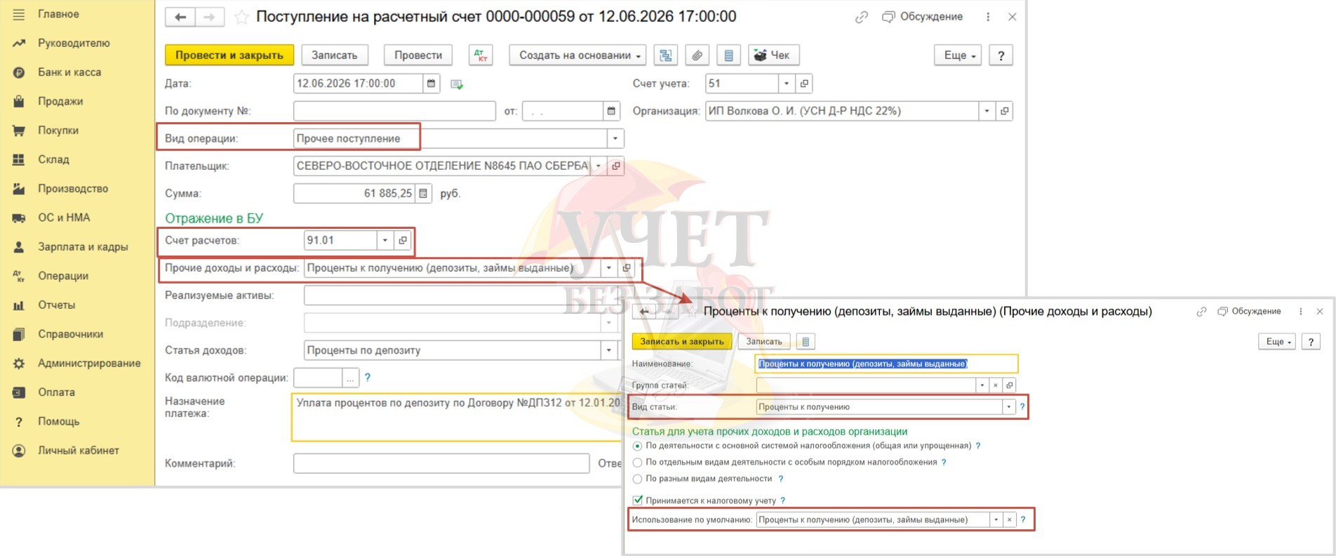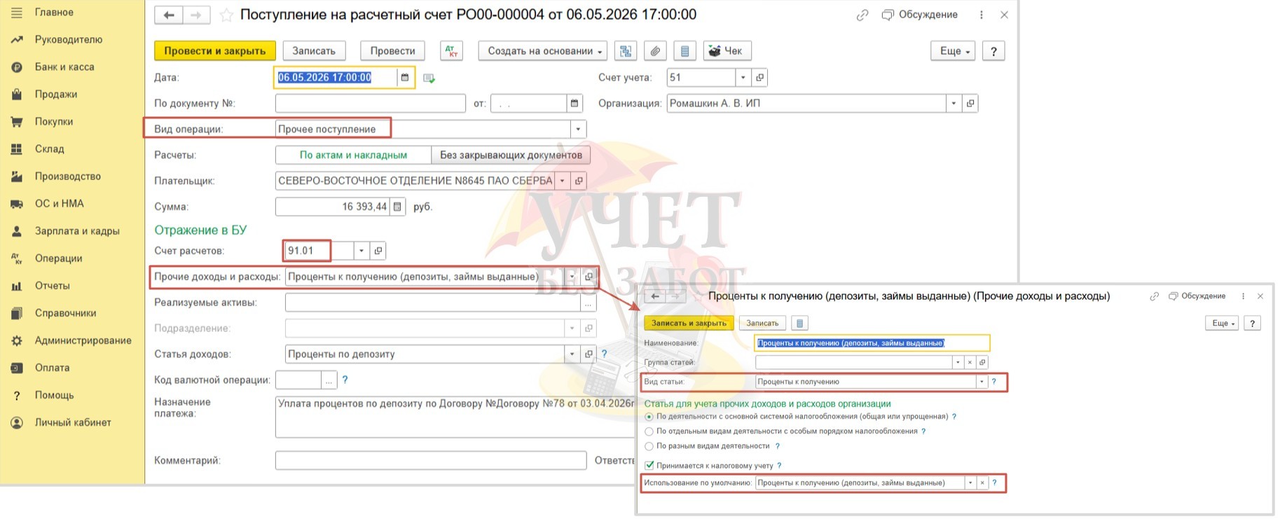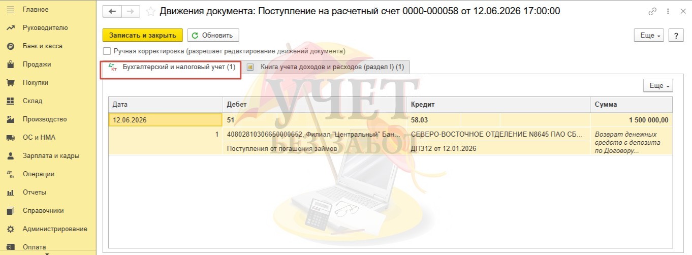 Алгоритм по учету депозита и процентов по нему для ИП с 2026 года в 1С: Бухгалтерии предприятия ред. 3.0