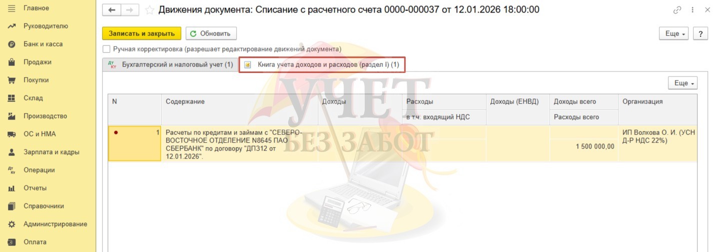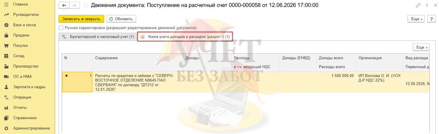 В регистре «Книга учета доходов и расходов (раздел I)» сумма денежных средств, вернувшихся с депозита, не учитывается в составе доходов в столбце «Доходы» с целью исчисления налога УСН. Однако специально включается в столбец «Доходы всего» как раз для тех пользователей, кто проверяет все поступления на расчетный счет с суммами в КУДИР.