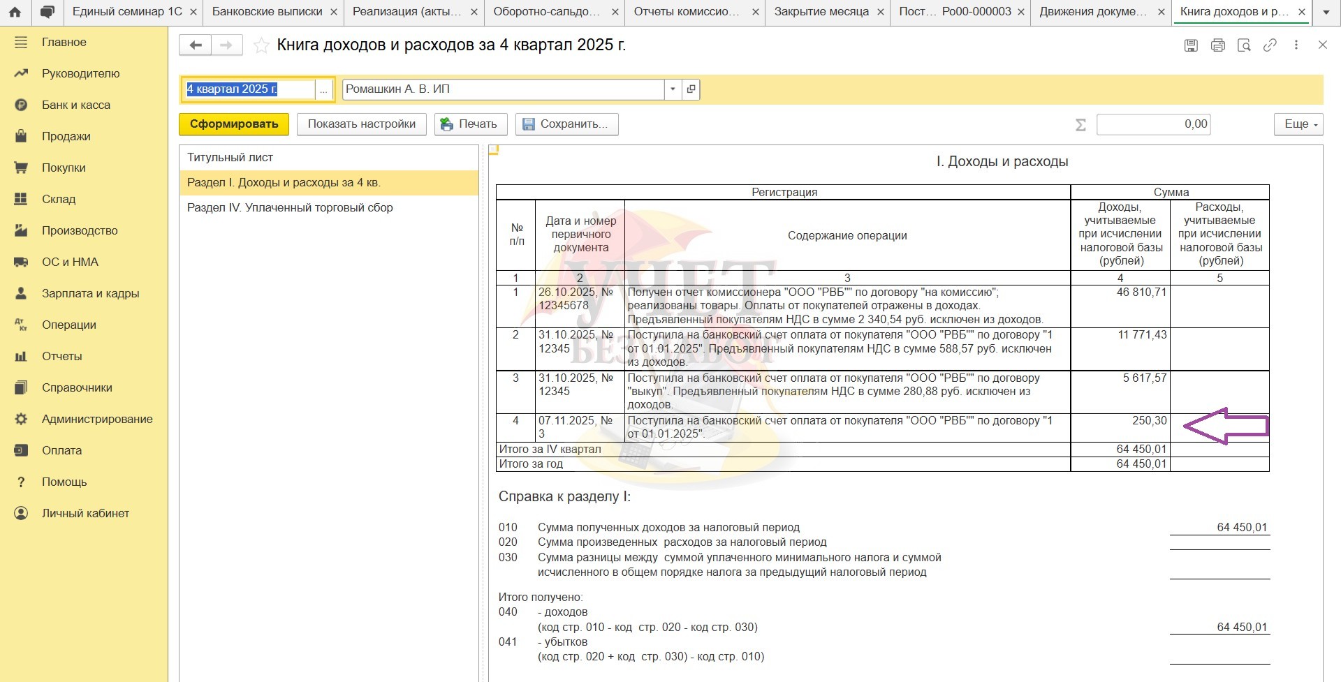 Сумма скидок по программе лояльности входит в итоговую сумму реализации за товар и загружается в отчет комиссионера по детализации, поэтому отдельно эту сумму проводить не нужно. Сумма вашего отчета о продажах будет соответствовать сумме в пункте 1 «Итого стоимость реализованного товара и услуг». Сумма скидок сюда уже входит: