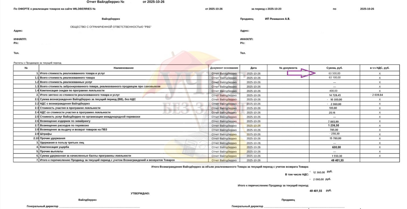 WB предоставляет нам отчет и доплачивает сумму «отрицательной услуги», поэтому считаем, что данная сумма является нашим доходом. Вспомним также, что возмещение расходов за выдачу товаров на ПВЗ и штрафы не облагаются НДС.