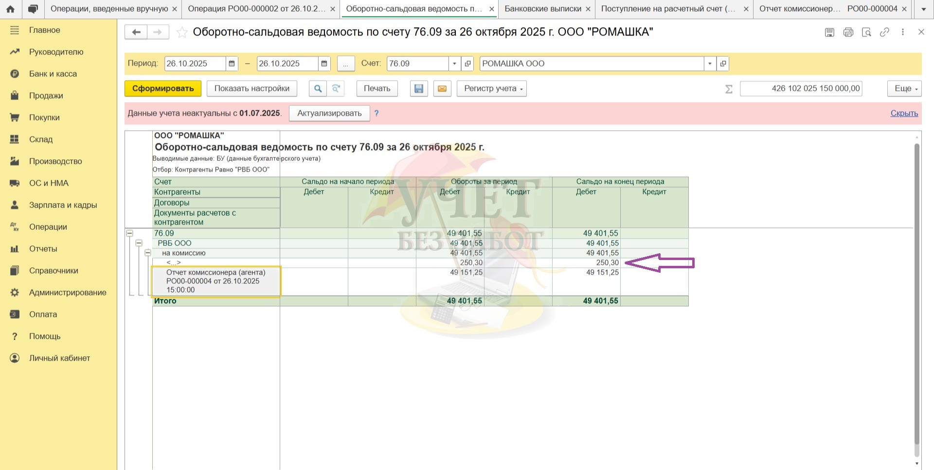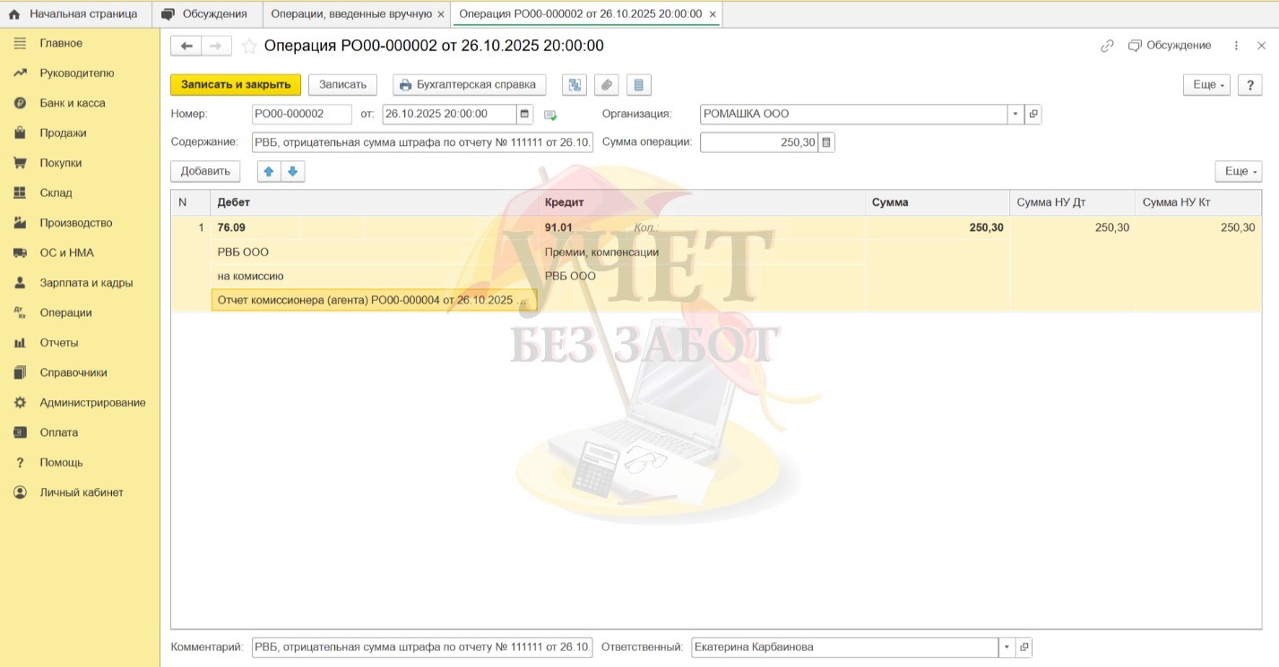 Ручную операцию подвязываем к отчету реализации (выбираем в качестве третьего субконто на счете 76.09), который мы проводим в том же периоде.