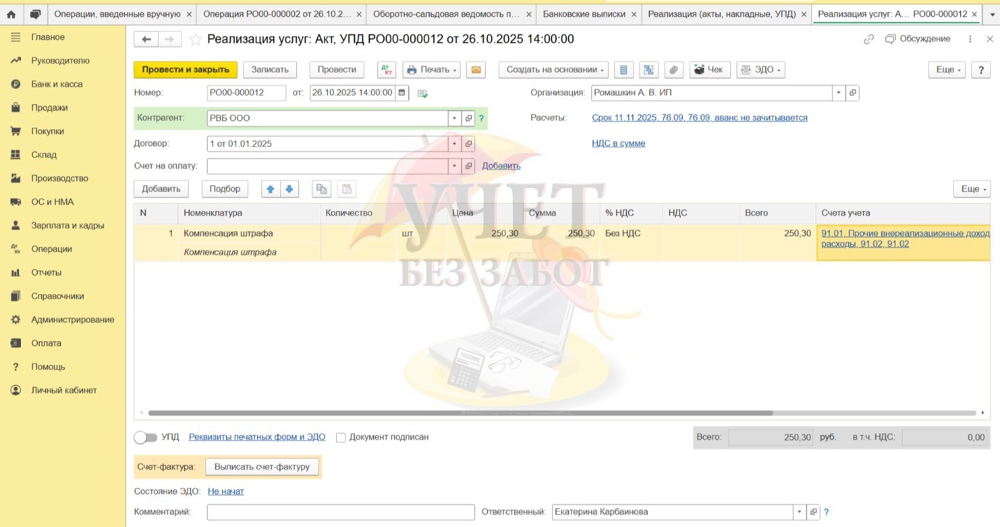 Если вы работаете на УСН, тогда вы можете провести реализацию услуг без НДС. Для этого создаете необходимую номенклатуру и проводите документ с положительной суммой, выбирая отдельный договор с покупателем.