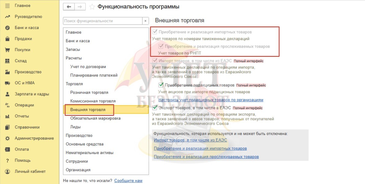 Напоминаем, что для включения учета прослеживаемых товаров в разделе меню «Главное» - «Функциональность» на вкладке «Внешняя торговля» необходимо включить одноименные флаги.