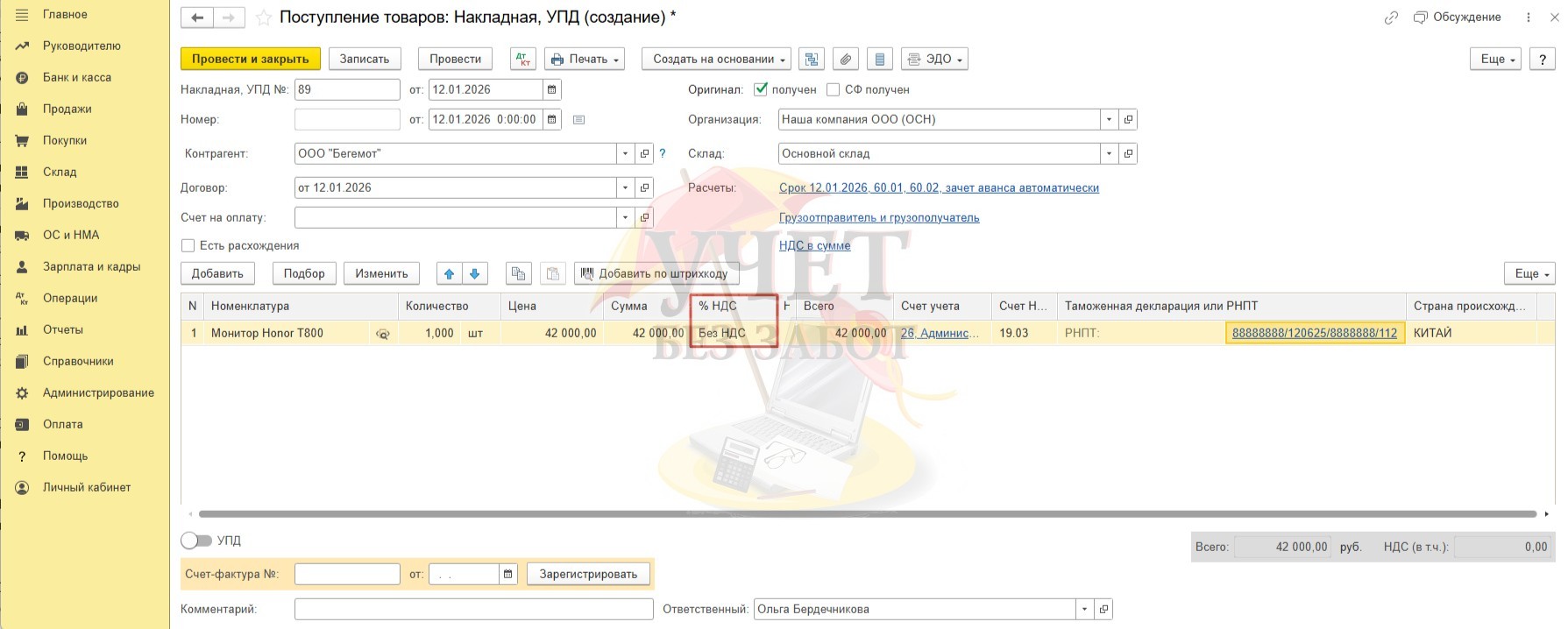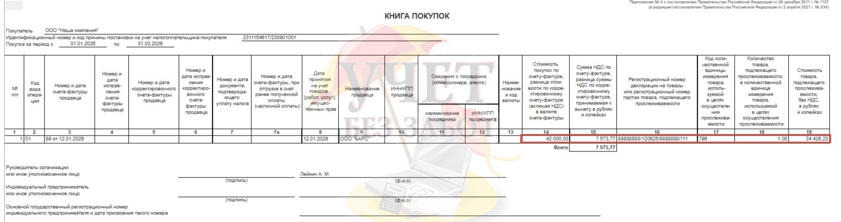 12.01.2026г – организация приобрела монитор (1шт.) на сумму 42 000 руб. (в т.ч. НДС – 7 573 руб. 77 коп.);