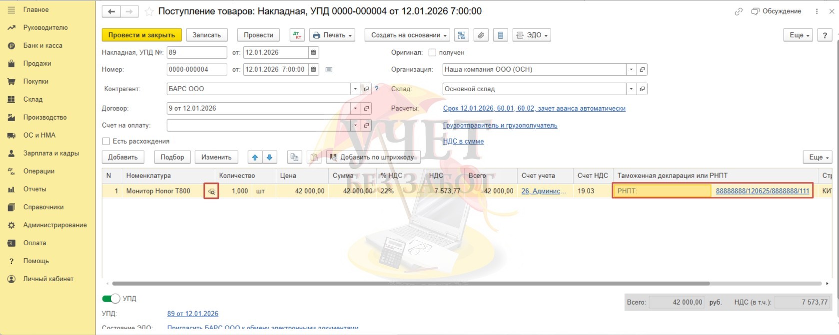 Почему? Потому что если были закуплены какие-либо прослеживаемые товары, а потом какие-то из них было решено использовать как малоценные ТМЦ или ОС, то право собственности на этот товар и РНПТ сохраняются до момента их выбытия. При таких настройках на текущей версии программа даже не выводит поле «РНПТ» в табличную часть.