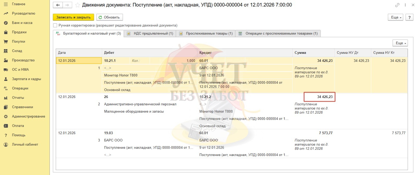 Посмотрим проводки документа: монитор теперь числится за конкретным сотрудником на счете МЦ.04, и его стоимость в налоговом учете тоже учтена.