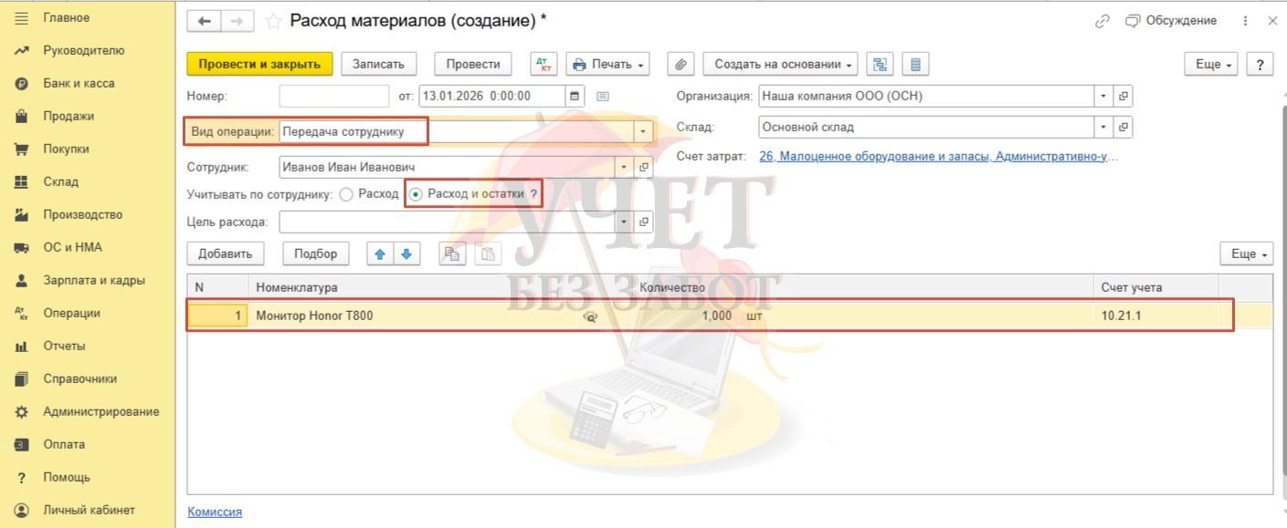 Важный нюанс! При заполнении этого документа в поле «Вид операции» следует выбрать «Передача сотруднику», а «Учитывать по сотруднику» - «Расход и остатки».
