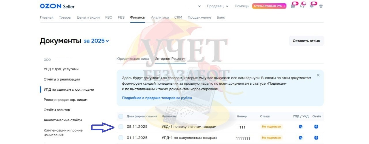 Начнем с личного кабинета OZON. Находятся УКД и отдельный отчет на возврат товаров там же, где и данные по выкупленному товару: раздел «Финансы» - «Документы» - «УПД по сделкам с юр лицами» - вкладка «Интернет решения»:
