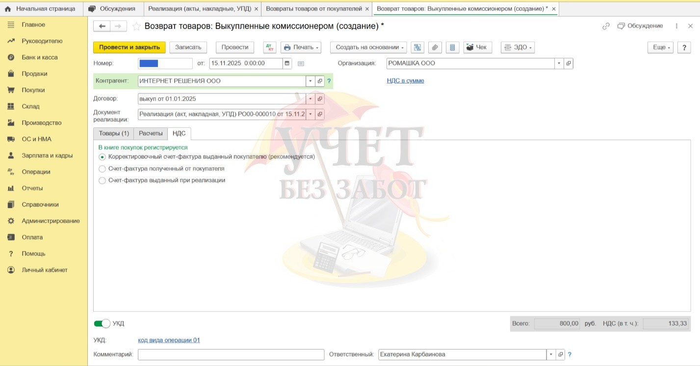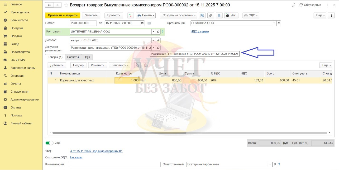 Реализация проведена 25.11.2025 в 14:00, поэтому поставим время возврата 15:00. Обратите на это внимание: соблюдение хронологии необходимо для корректного ведения учета.