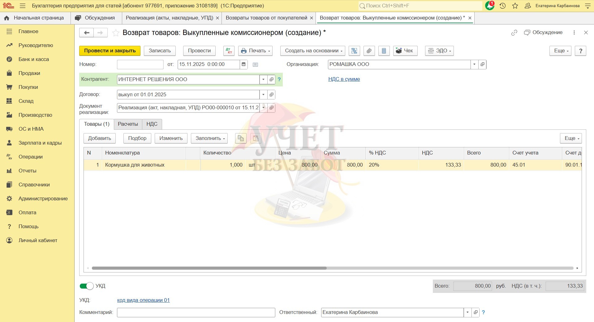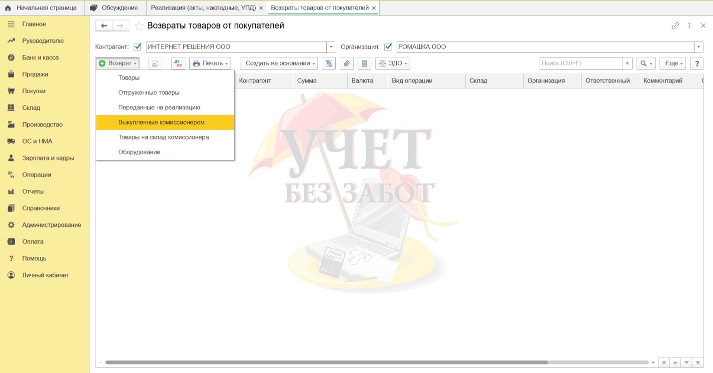 Для этого заходим в раздел меню «Продажи» - «Возвраты от покупателей». Создаем возврат с видом «Выкупленные комиссионером»: